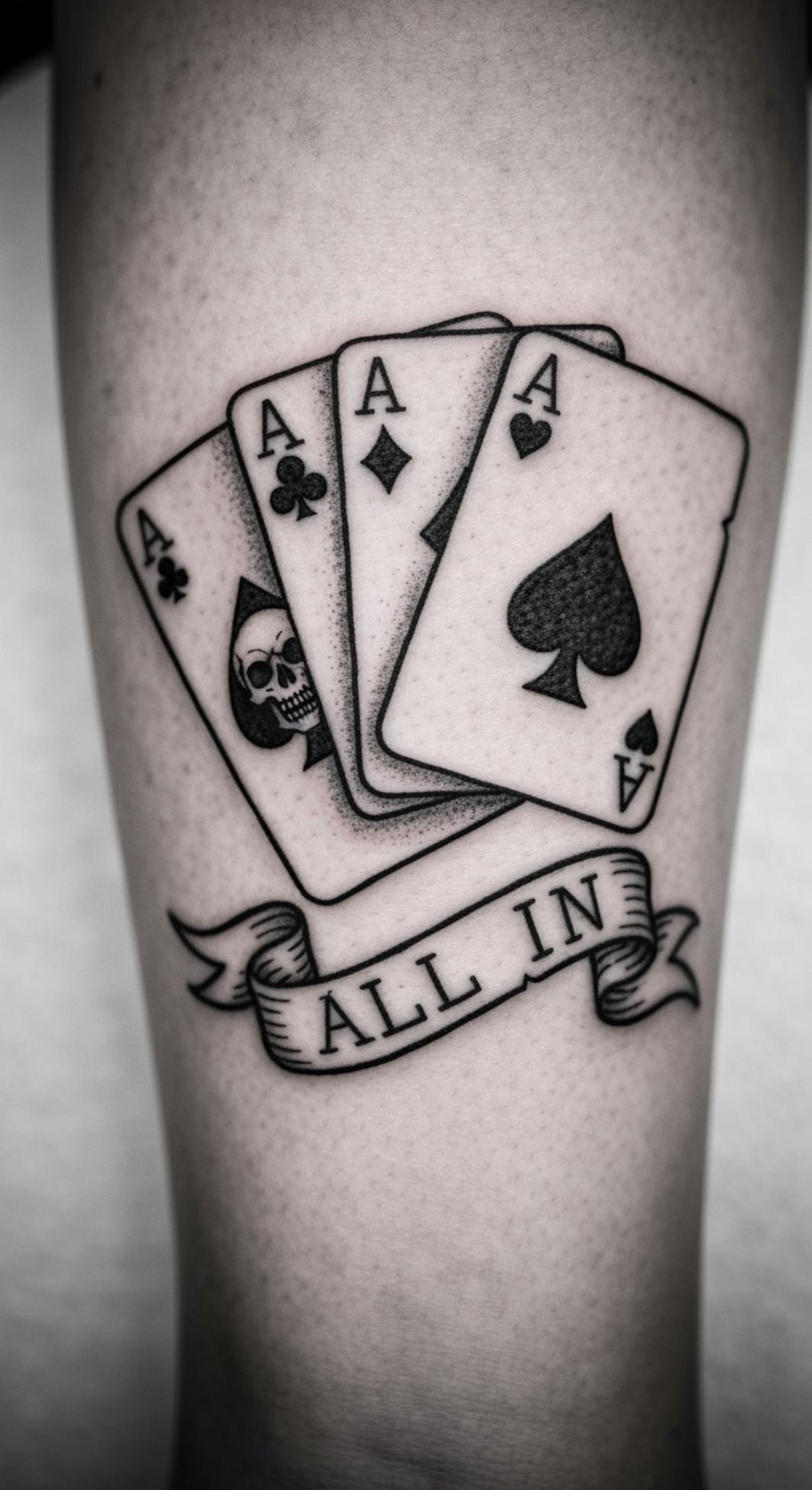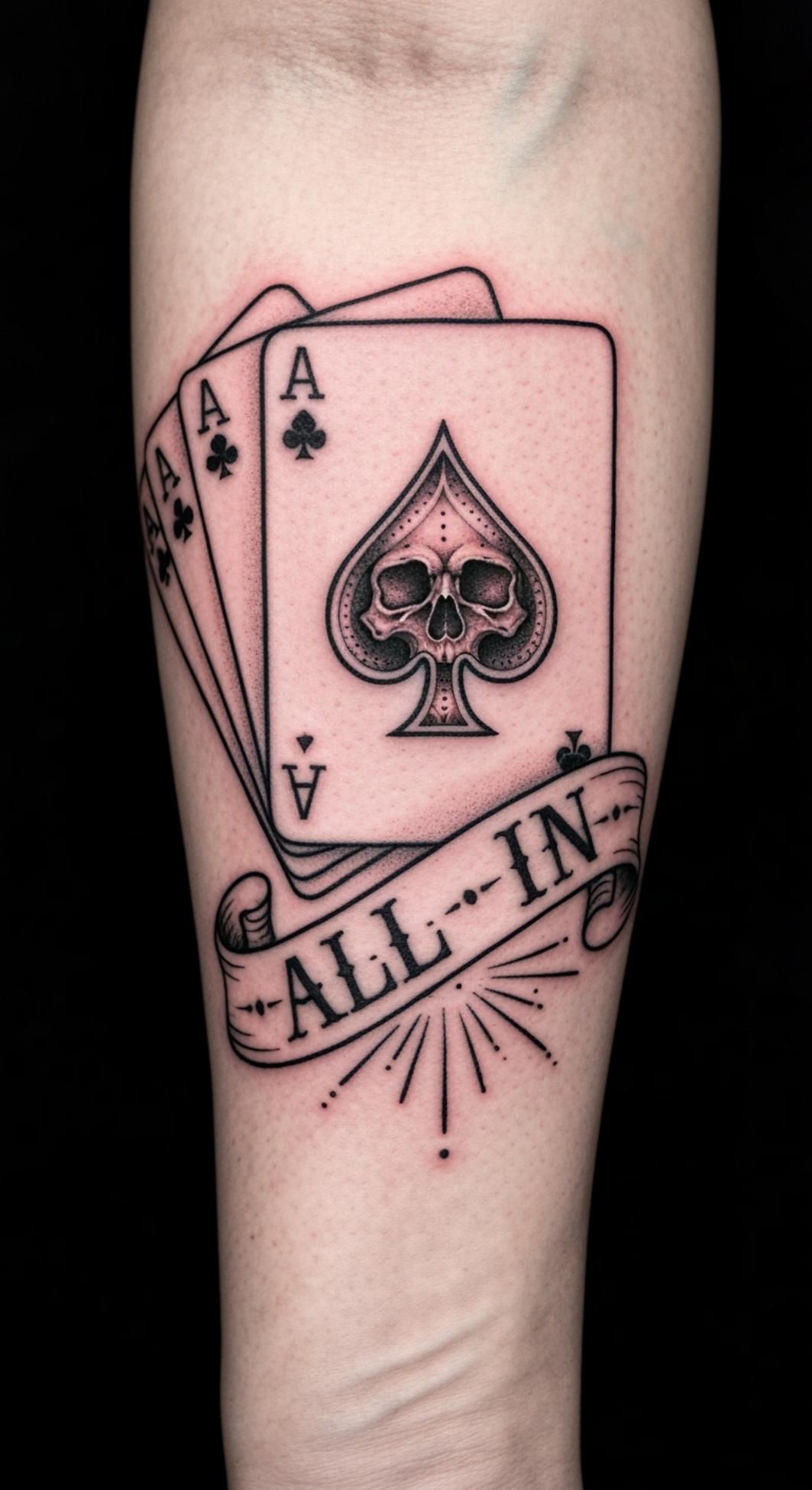 This powerful tattoo concept fuses the symbolism of the ace cards with the relentless image of a skull, representing absolute victory, risk-taking, and mastery over one’s fate. The skull at the heart of the spade epitomizes fearlessness in the face of danger and the willingness to confront life’s harshest challenges head-on.