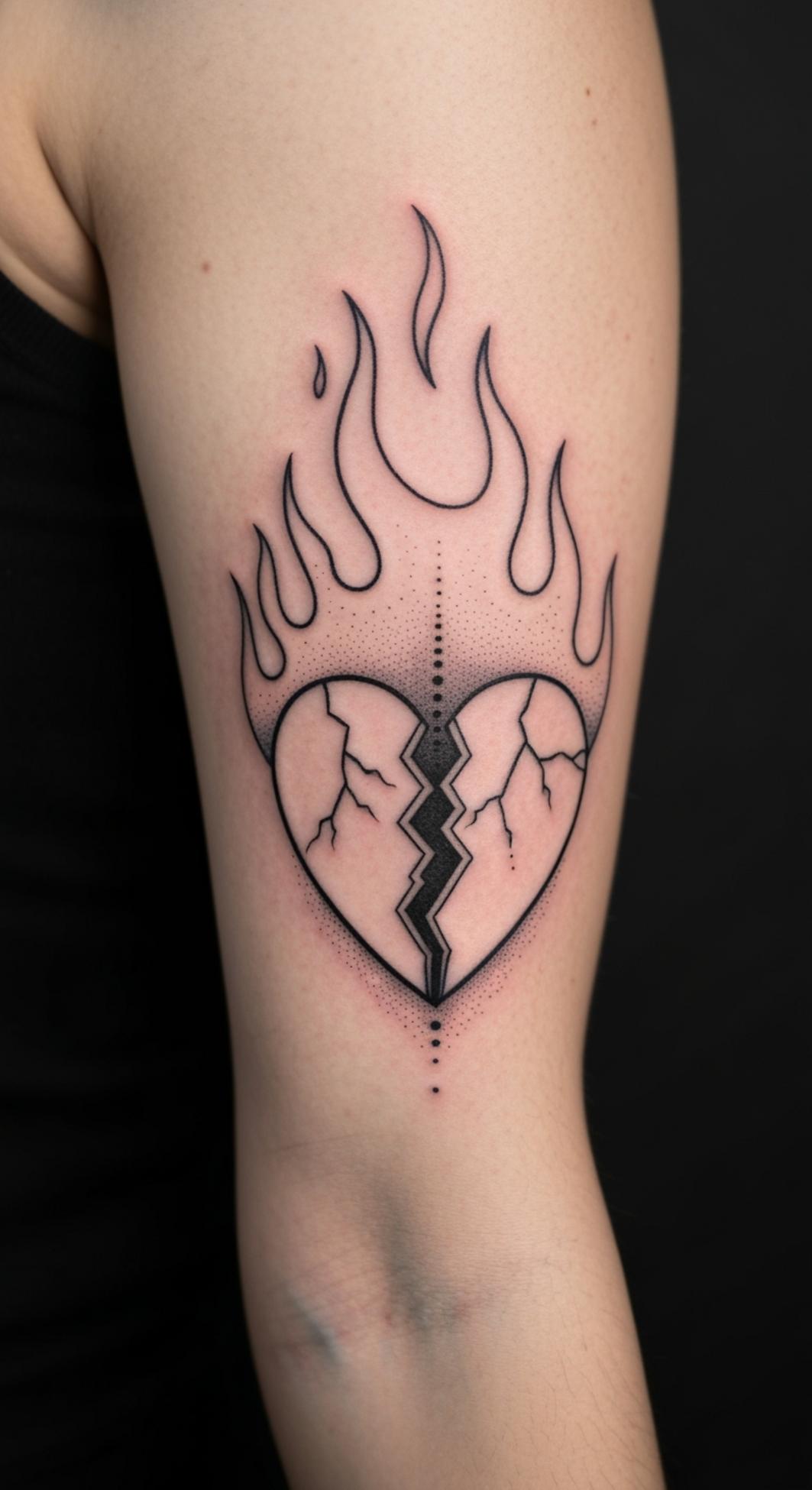 This striking tattoo concept channels the raw energy of resilience through the fusion of a cracked heart and bold, rising flames. The heart, split yet unyielding, symbolizes the trials of intense emotion and the transformative power that comes from embracing one’s scars.