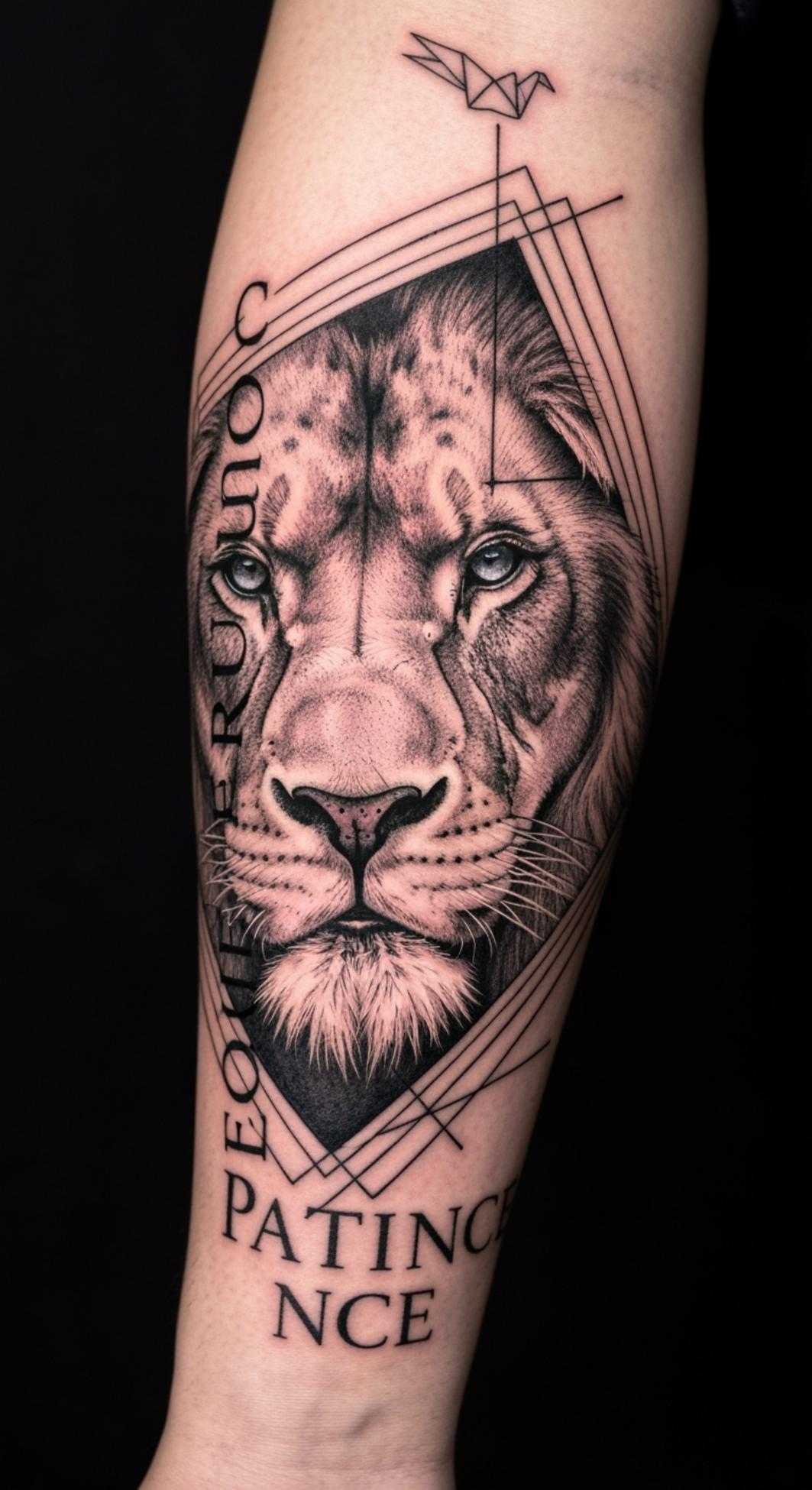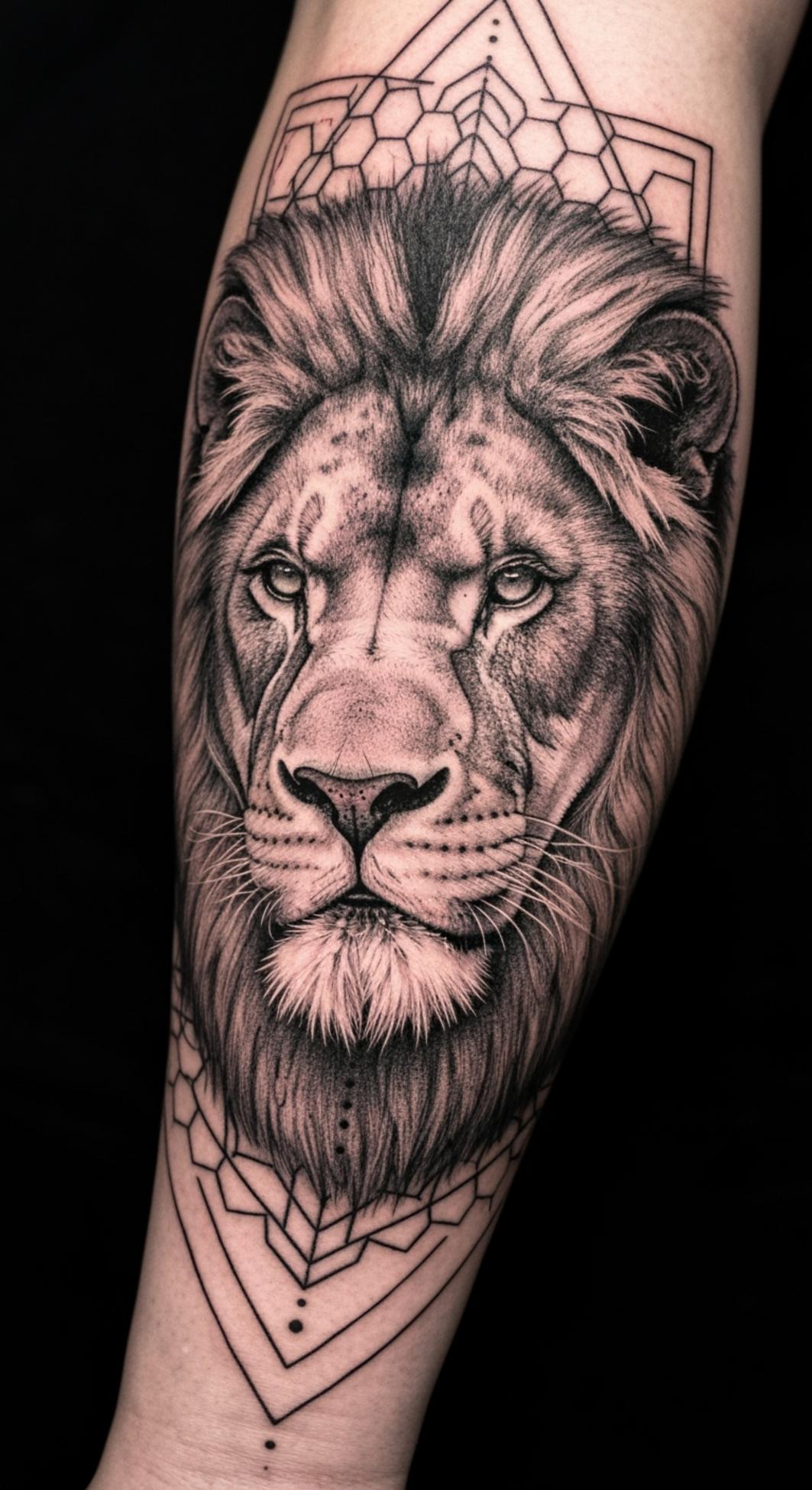 This tattoo seamlessly fuses the regal presence of a lion with geometric and modern motifs, symbolizing an unwavering spirit that balances raw power with deliberate restraint. The lion, often revered as the ultimate emblem of strength and authority, conveys not only dominance but also noble leadership and resolve.