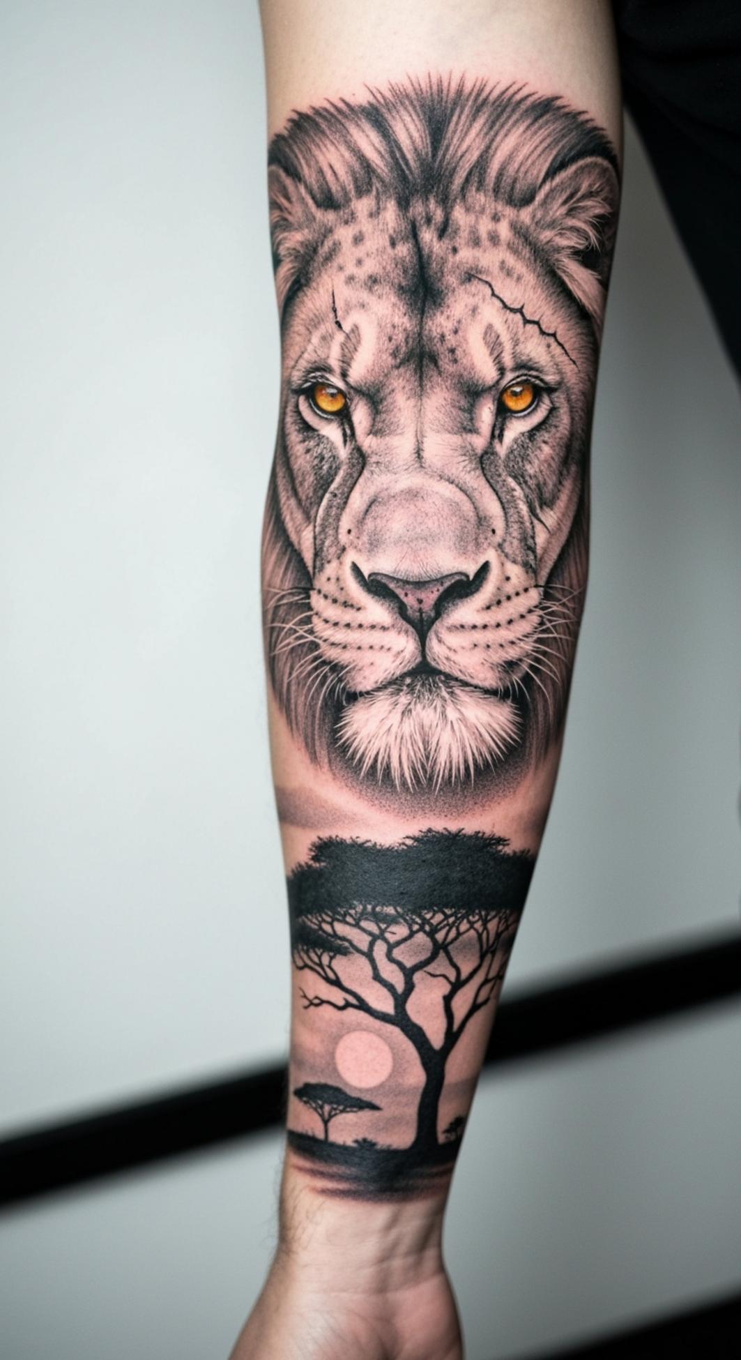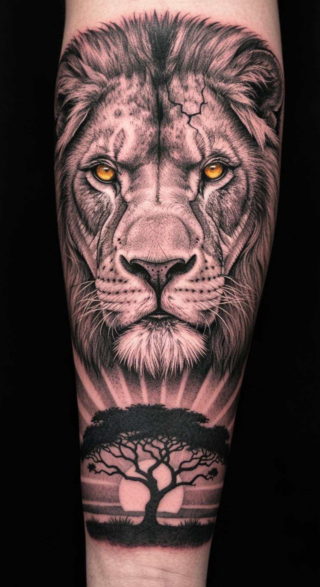 This tattoo embodies the commanding power and regal presence of the lion, a universal symbol of courage, leadership, and unyielding spirit. The intense gaze and striking amber eyes evoke a deep sense of vigilance and dominance, while the subtle scar motifs suggest hard-won wisdom and perseverance through adversity.