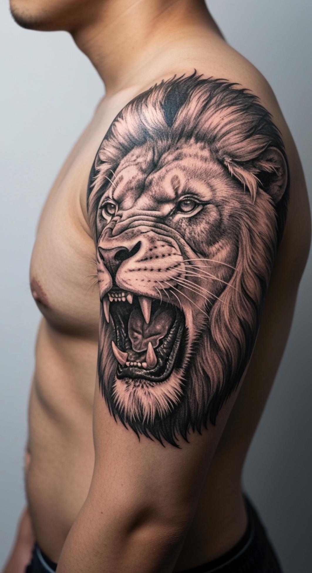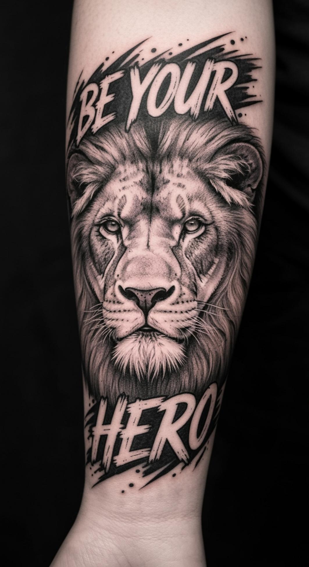 Commanding a sense of self-determination and raw courage, this lion tattoo captures the untamed spirit of leadership and personal strength. The lion—universally revered as a symbol of authority, loyalty, and unyielding resolve—serves here as an emblem for facing adversity head-on.