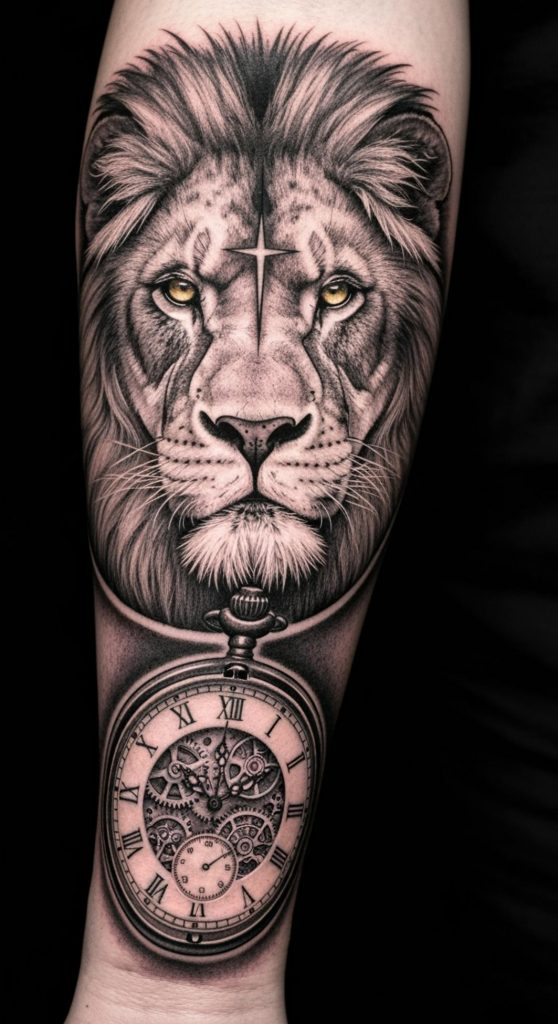Throughout history, the lion has stood as a symbol of unyielding spirit and inner resolve, while the clock reminds us to seize each moment with purpose, and the cross hints at a guiding set of beliefs or a higher calling. For men drawn to qualities of dominance and noble strength, this bold composition is both a celebration of masculine power and a reflection of personal conviction.