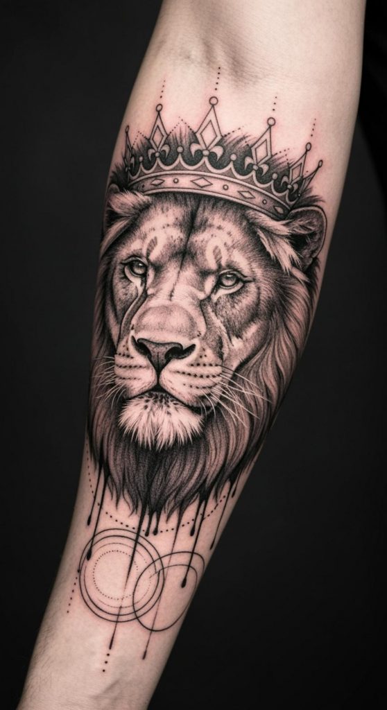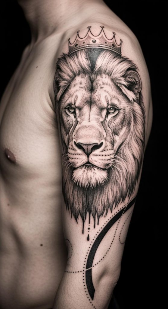 This striking tattoo concept centers around the lion, universally revered as a symbol of courage, supremacy, and unyielding spirit. The addition of the crown elevates the image to speak of power, self-mastery, and earned leadership, weaving together ancient heraldic traditions with a modern edge.