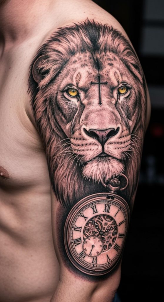 This compelling tattoo harnesses the primal force of the lion to evoke an enduring message of courage and authority. The lion, long revered as the king of beasts, is deeply entwined with themes of leadership, fearlessness, and resilience; when paired with the iconic cross and a meticulously detailed timepiece, the imagery deepens, speaking to faith, morality, and the relentless passage of time.