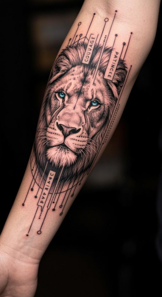 This tattoo seamlessly fuses the regal presence of a lion with geometric and modern motifs, symbolizing an unwavering spirit that balances raw power with deliberate restraint. The lion, often revered as the ultimate emblem of strength and authority, conveys not only dominance but also noble leadership and resolve.