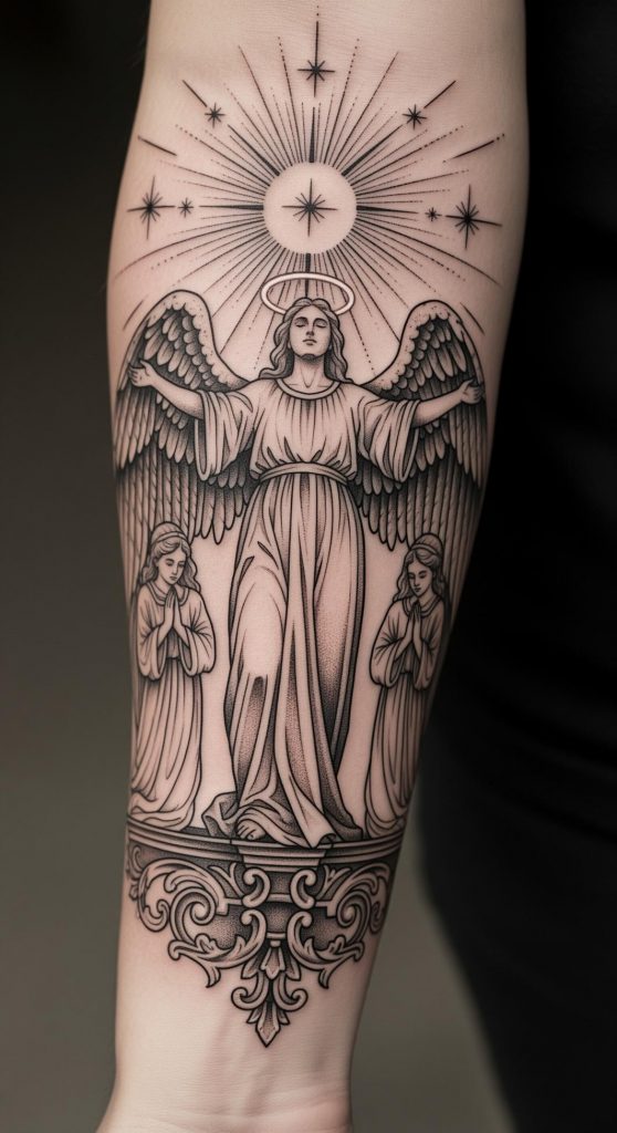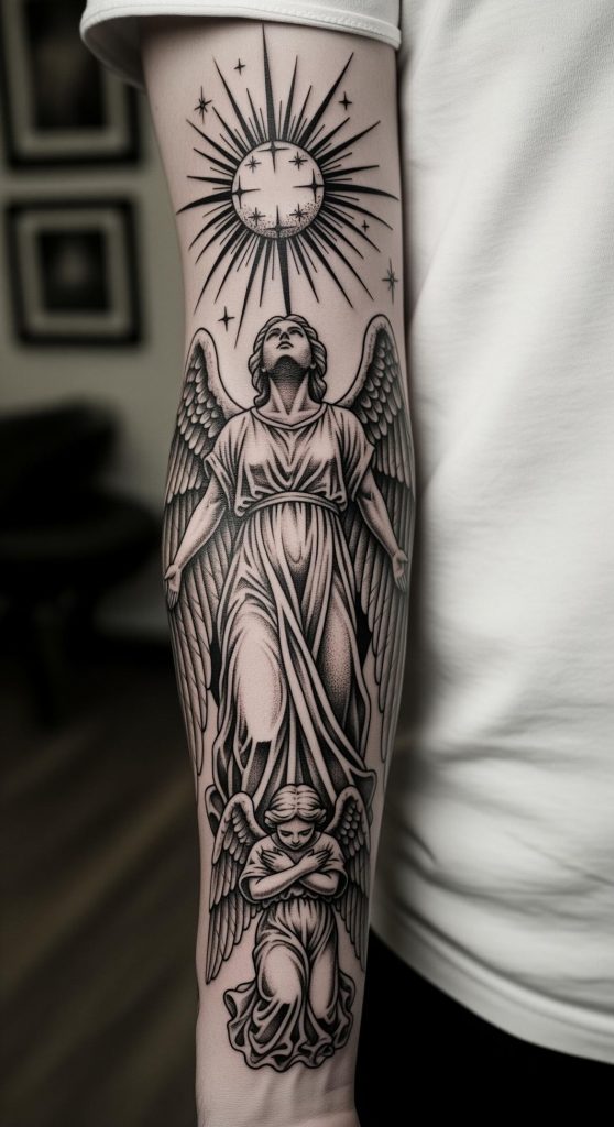 This commanding tattoo captures the essence of guardianship and enlightenment, conveyed through the bold imagery of an angelic figure reaching skyward beneath a radiant celestial body. Drawing on centuries of mythological and religious tradition, the design channels themes of sacrifice, spiritual elevation, and unwavering moral strength.