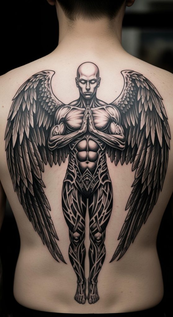 This striking tattoo captures the image of a powerful angel, wings unfurled in a dramatic display of dark strength and resilience, serving as a symbol of both spiritual guardianship and inner fortitude. The design’s intricate, almost anatomical rendering of wings and the solemn, armored figure evokes ancient icons of protection and the timeless struggle between light and darkness.