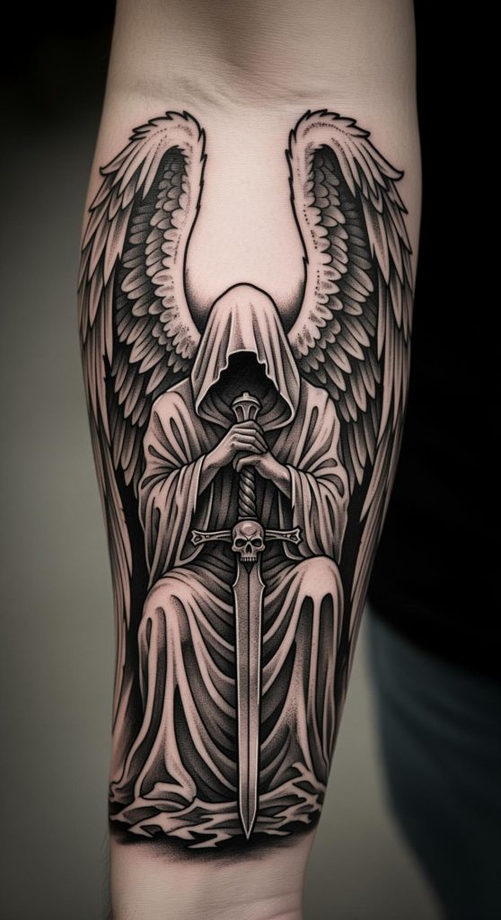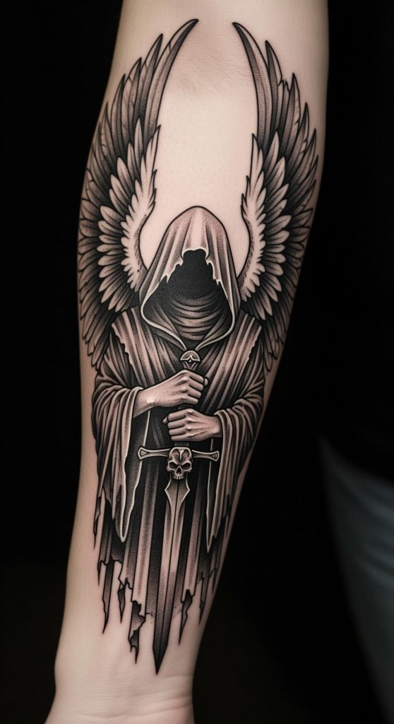 This tattoo concept embodies the powerful presence of the angelic warrior, a symbol deeply rooted in themes of protection, resilience, and unwavering strength. Cloaked in shadow and wielding a mighty sword, the figure exudes an aura of both mystery and steadfast guardianship, echoing legends of celestial beings who stand watch over humanity in times of darkness.