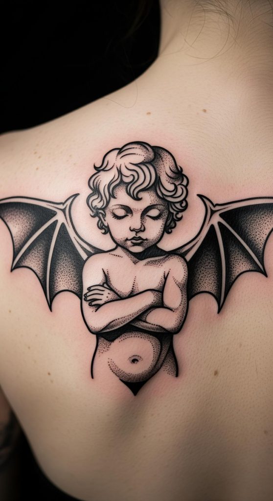This tattoo captures the duality of innocence and rebellion, using the motif of a cherubic angel with bold, bat-like wings to challenge traditional notions of purity. The design bridges the realms of light and darkness, suggesting a struggle between virtue and temptation that resonates deeply with themes of inner strength and autonomy.