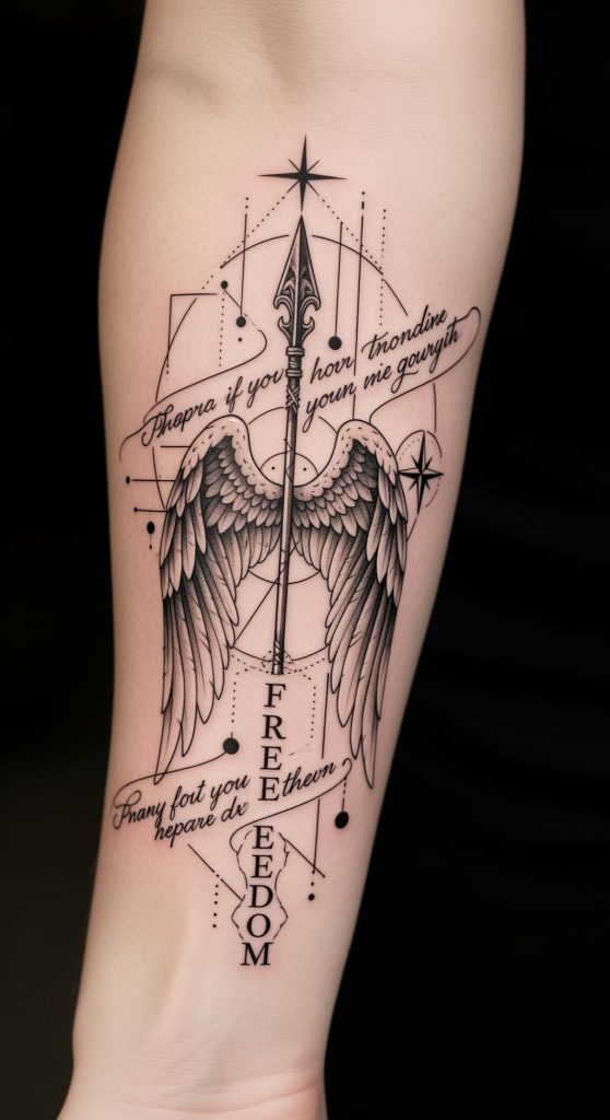 This tattoo seamlessly fuses the timeless symbolism of angelic wings with the resolute power of a spear, encapsulating the dynamic interplay between protection and strength. The wings, a universal motif of guidance and transcendence, evoke a sense of spiritual elevation and the pursuit of higher ideals, while the spear signifies action, courage, and the readiness to confront life’s battles.