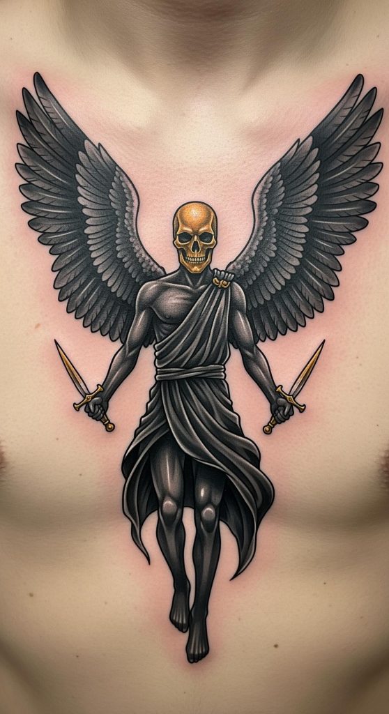 This unique tattoo concept brings together the timeless symbolism of the angel with a bold, modern twist, blending themes of protection, mortality, and power. Its darkened wings and skeletal visage evoke the duality of life and death, while the golden daggers suggest both divine authority and unwavering will.