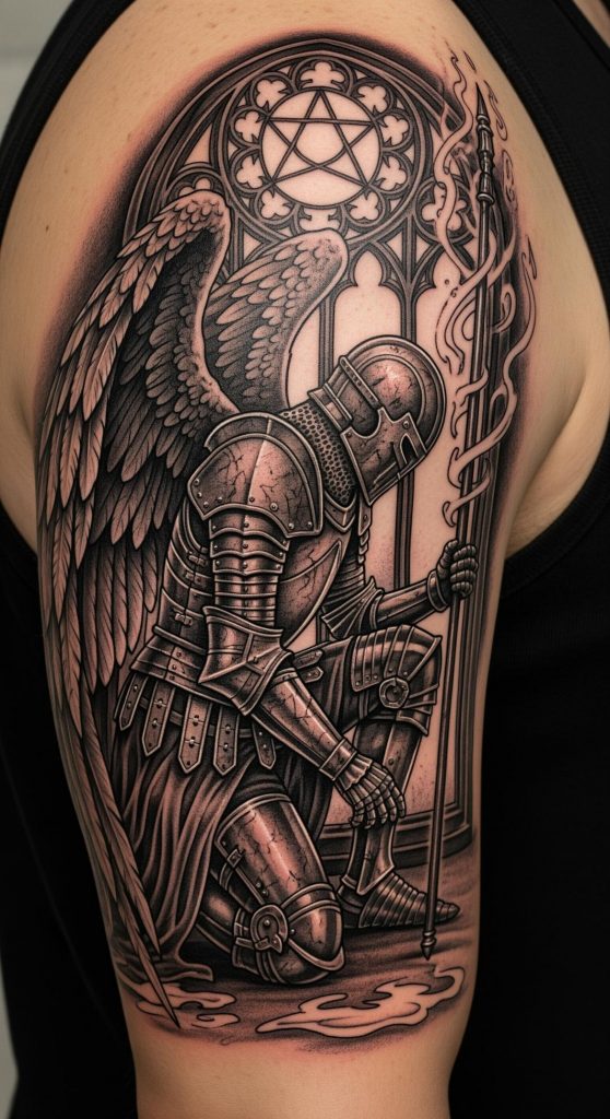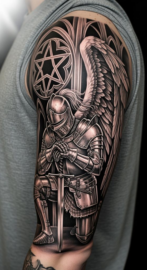Rooted in classical art, the tattoo’s intricate shading and detailed lines evoke Renaissance sculptures, underscoring a respect for tradition and spiritual strength. For men, this design conveys a bold commitment to defending values and persevering through life’s challenges with integrity and resolve.