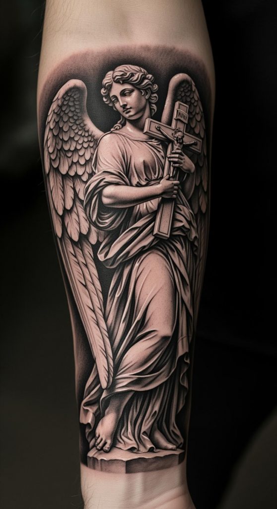 1. Realistic Angel With Cross Forearm