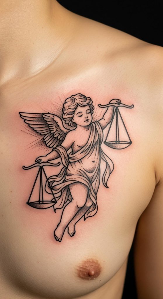 This tattoo captures the essence of justice balanced with divine guardianship, symbolized by an angelic figure carrying the scales. The integration of the scales—a timeless emblem of fairness and accountability—alongside angelic imagery evokes ideals of strength, order, and moral vigilance.