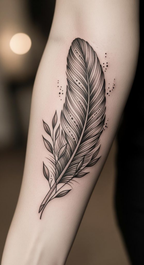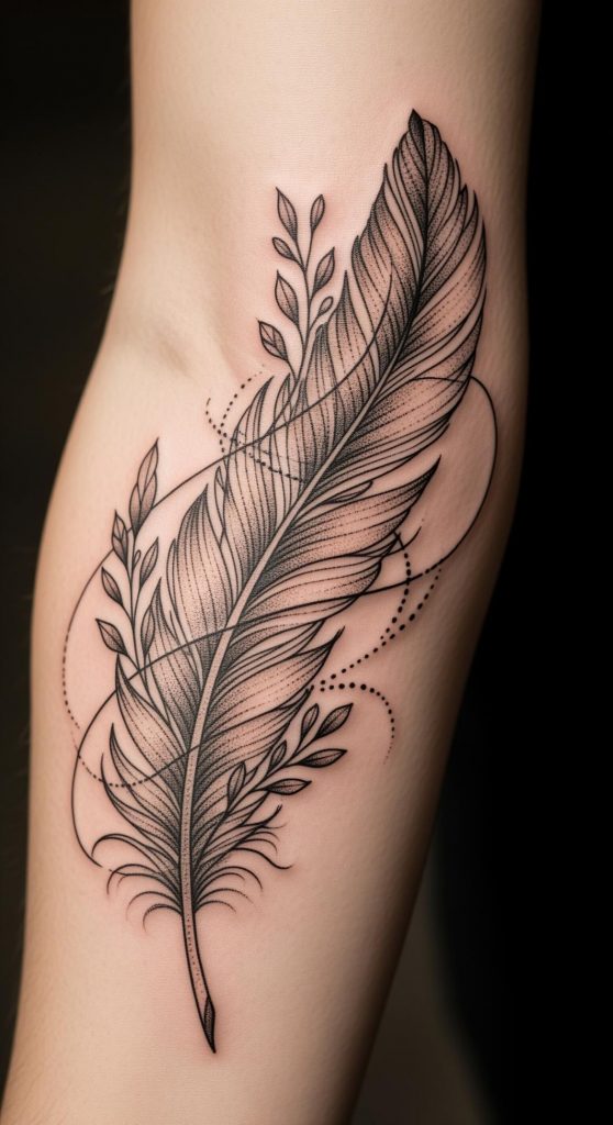 This striking tattoo showcases a delicate feather intertwined with sprigs of budding leaves, symbolizing freedom, transformation, and the gentle power of growth. Feathers have long been connected to aspirations, spiritual journeys, and a sense of lightness in the face of life’s challenges, while the leafy branches evoke renewal and resilience.