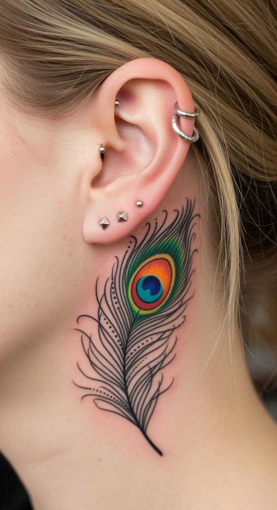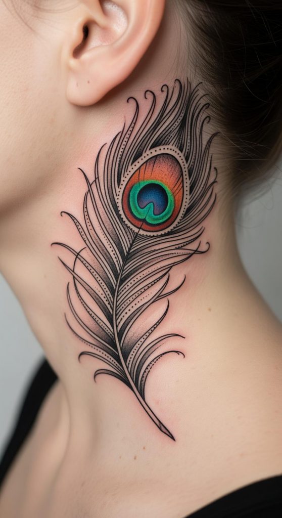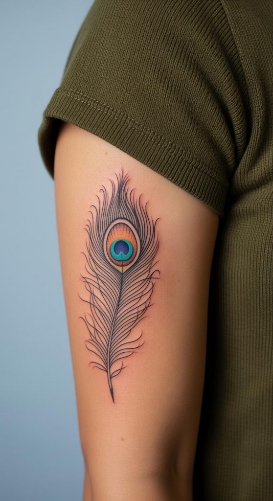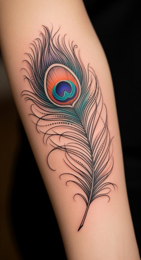This vibrant tattoo, inspired by the delicate plume of a peacock feather, conveys a radiant sense of beauty, individuality, and inner radiance. The peacock has long symbolized self-confidence, renewal, and spiritual awakening, as well as the celebration of uniqueness and feminine creativity through its dramatic display of color.