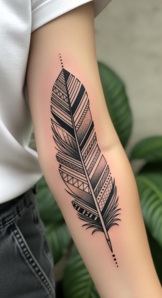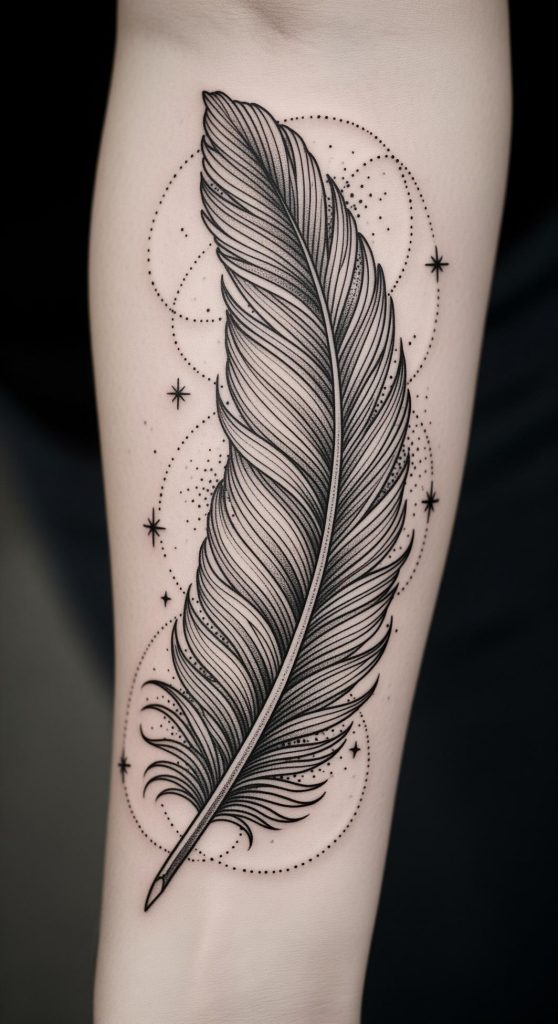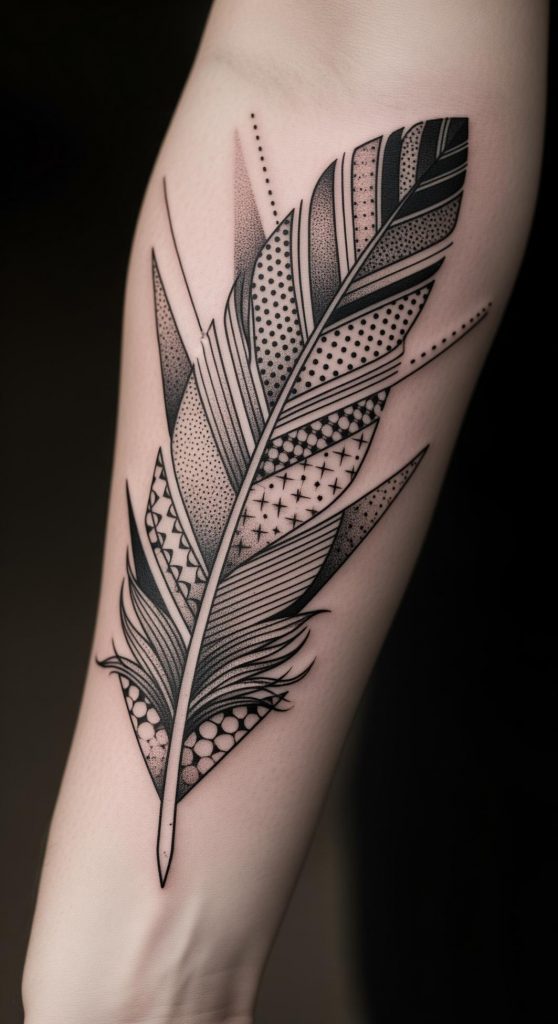 This tattoo concept beautifully blends the timeless symbolism of the feather—a universal emblem of freedom, transformation, and spiritual elevation—with modern geometric artistry that speaks to individuality and self-expression. Feathers have long been associated with ancient wisdom, acting as messengers between realms and representing the lightness of being as well as resilience in the face of change.