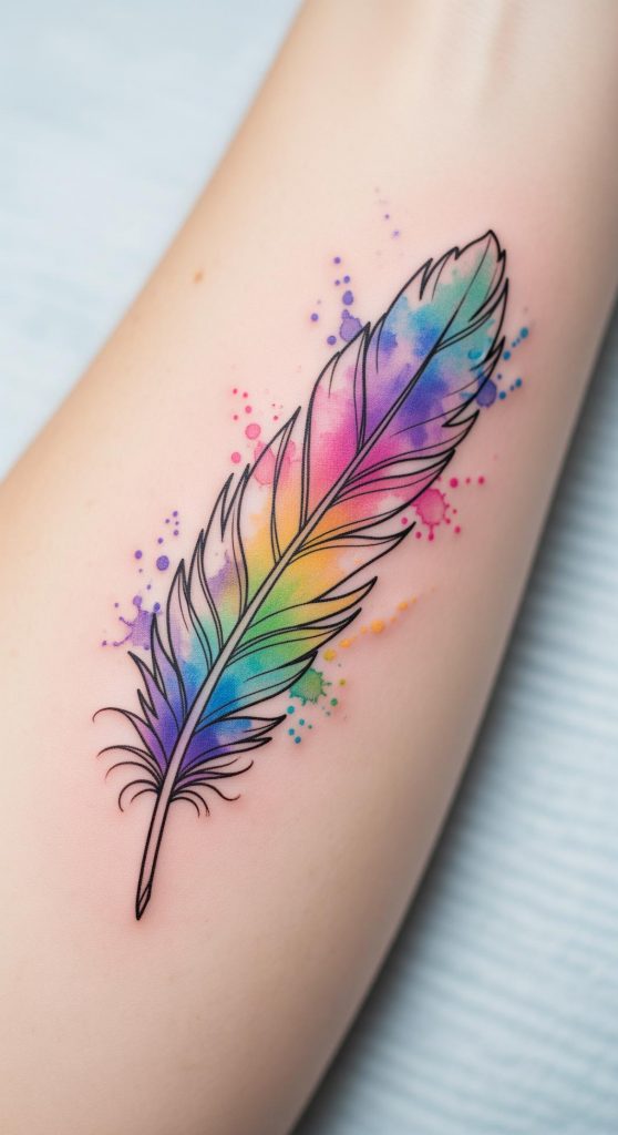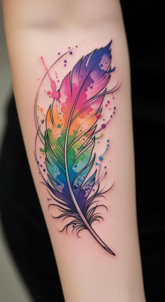 Choosing a feather tattoo in this luminous, artistic style is a profound way to honor personal growth, resilience, and the vibrant journey of becoming your truest self.