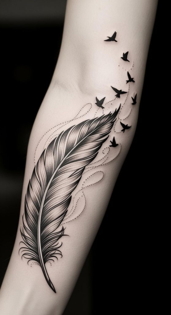 This captivating feather tattoo evokes a sense of freedom, transformation, and the gentle pursuit of dreams. Traditionally, feathers symbolize lightness of spirit and the ability to rise above challenges, while the design’s accompanying flock of soaring birds amplifies themes of hope, release, and new beginnings.