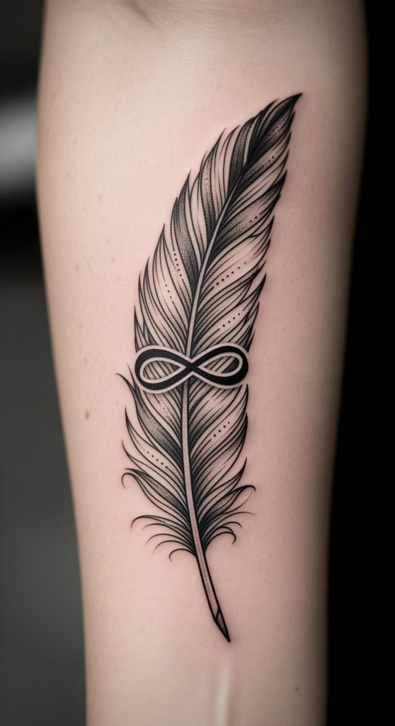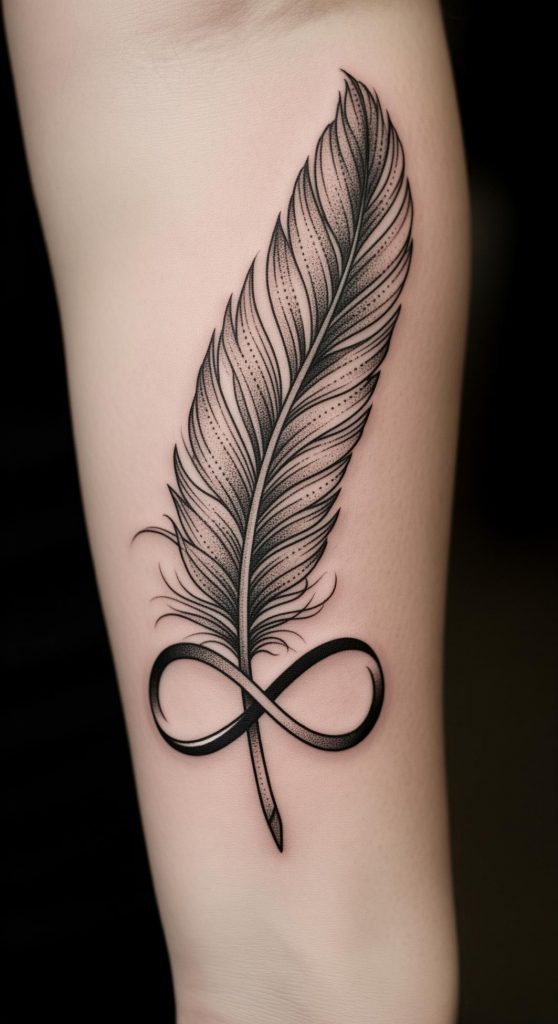 This tattoo design masterfully blends the motif of a delicate feather with the boundless loop of the infinity symbol, evoking a sense of limitless freedom and eternal resilience. The feather, historically recognized as a symbol of liberation, lightness, and spiritual transcendence, merges seamlessly with the infinity sign, reinforcing the idea of unending possibility and enduring strength.