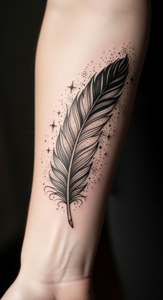 The surrounding constellation of delicate stars accentuates the feather’s ethereal quality, conjuring a dreamlike connection to the cosmos and inviting reflections on destiny and inspiration. For women, this motif speaks to inner creativity, intuitive wisdom, and the ability to move through life with quiet elegance.