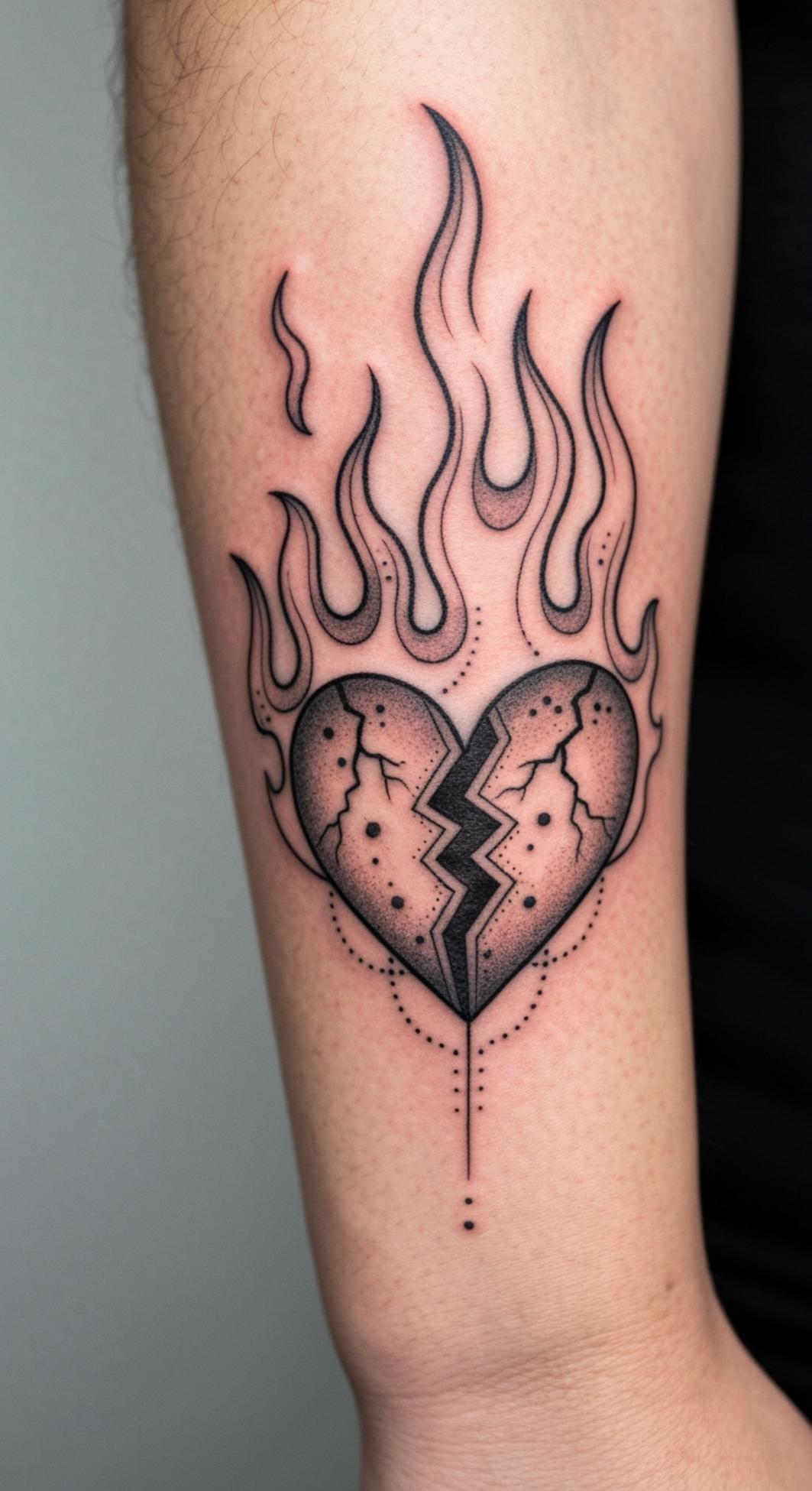 This tattoo concept fuses the imagery of a broken heart and rising flames, embodying the raw resilience that can emerge from deep emotional pain. The fractured heart is a timeless symbol of loss and vulnerability, yet the dark flames suggest an indomitable spirit fueled by hardship and adversity.