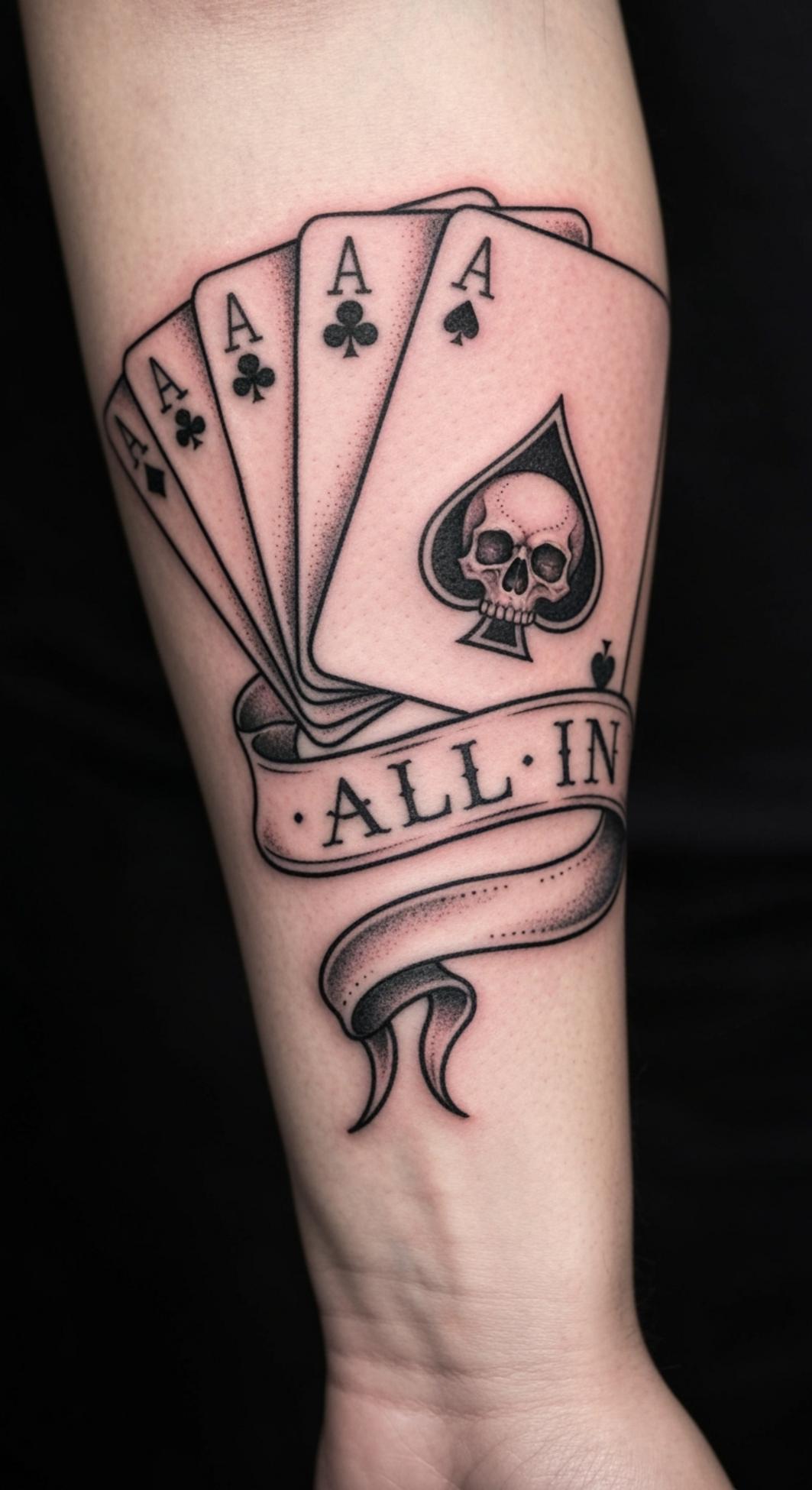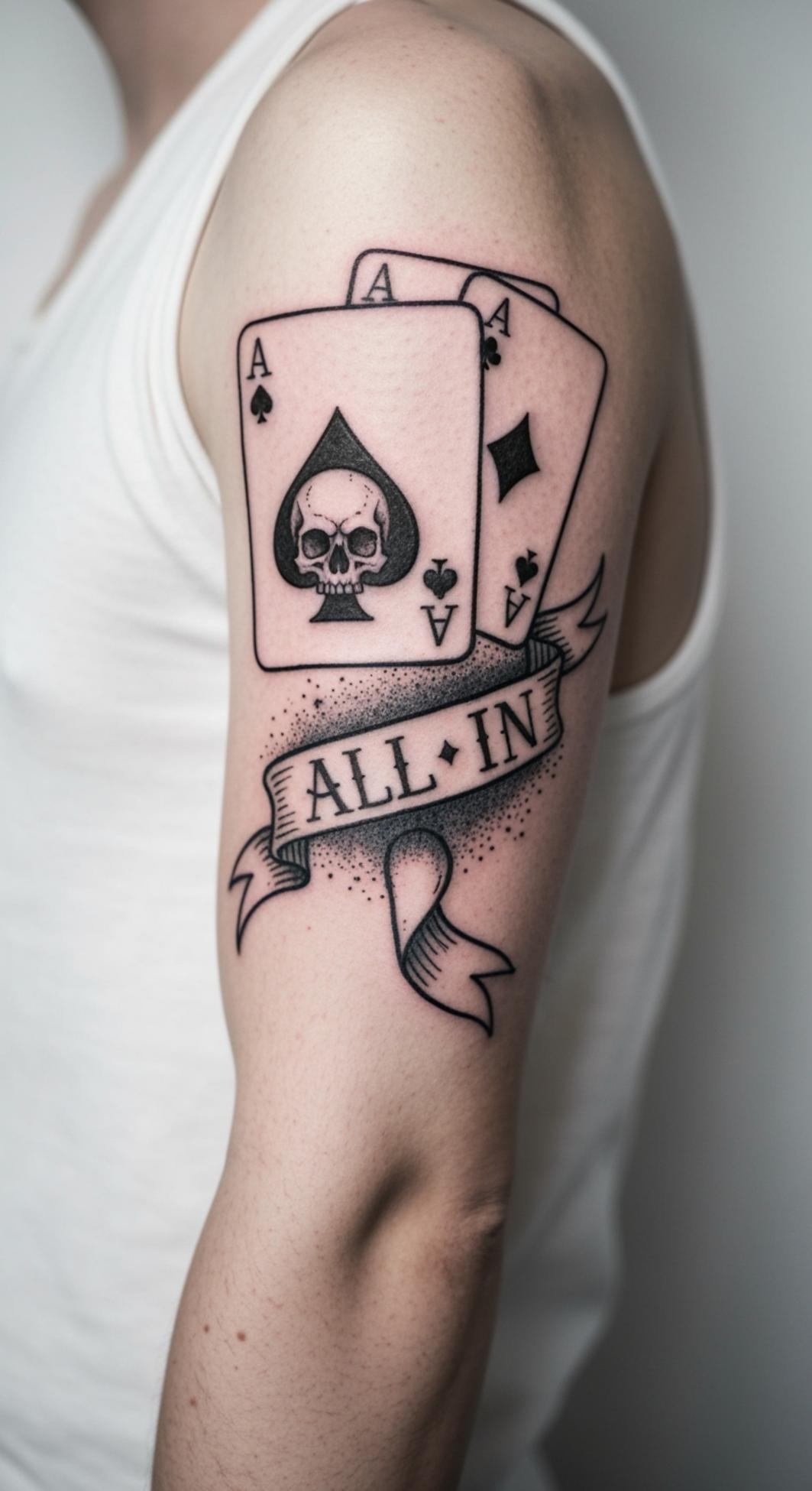 This tattoo delivers a powerful statement of risk, fate, and the embrace of life’s uncertainties through its potent imagery. The combination of four aces, especially the skull-emblazoned ace of spades, speaks to themes of mastery, dominance, and the ever-present shadow of mortality—a timeless symbol in both gaming and life’s greatest battles.