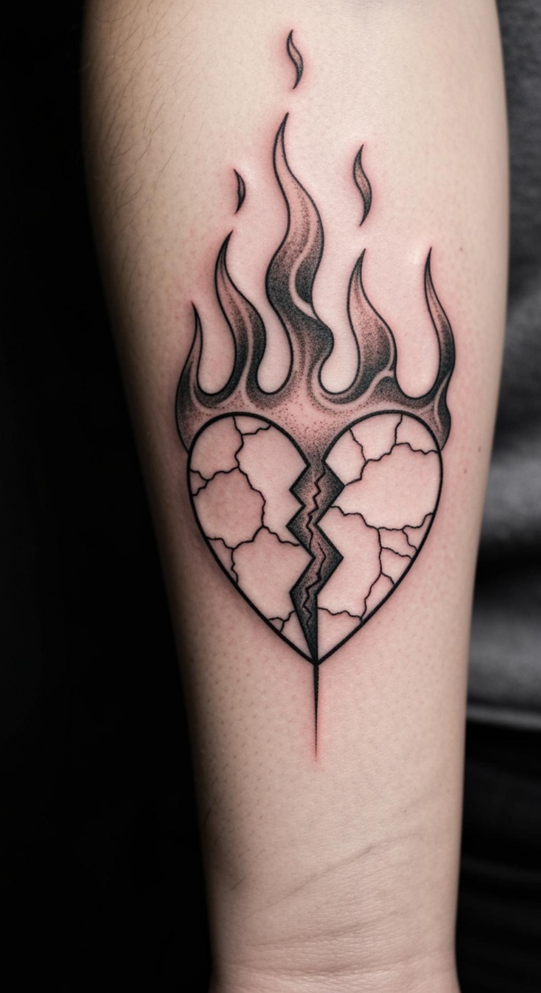 This striking tattoo concept merges the deeply symbolic imagery of a shattered heart and bold flames, representing a powerful narrative of resilience and transformation through pain. The crack in the heart signifies profound emotional experiences—loss, heartbreak, or struggle—while the flames rising from its core evoke the unyielding spirit that emerges from adversity.
