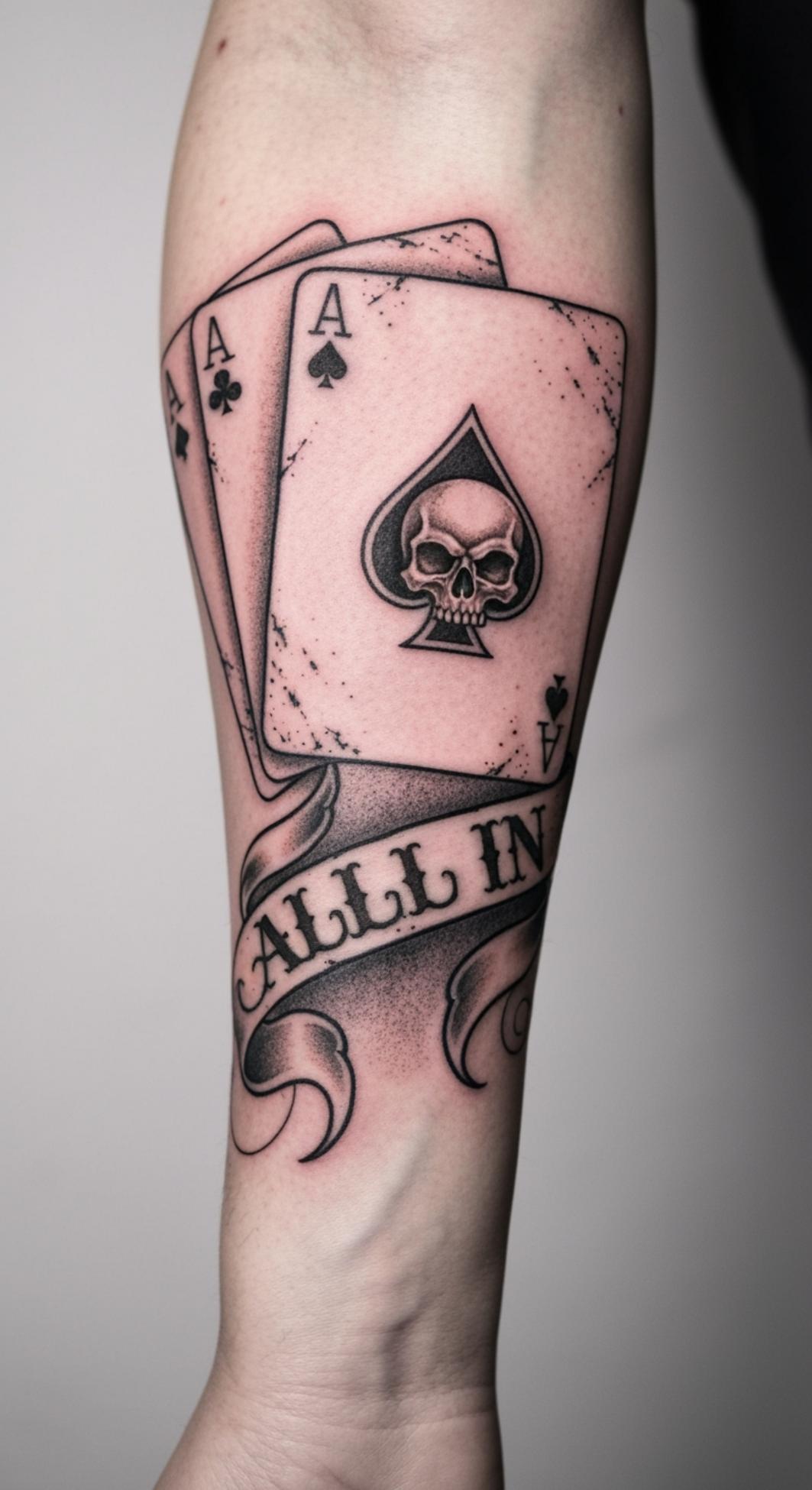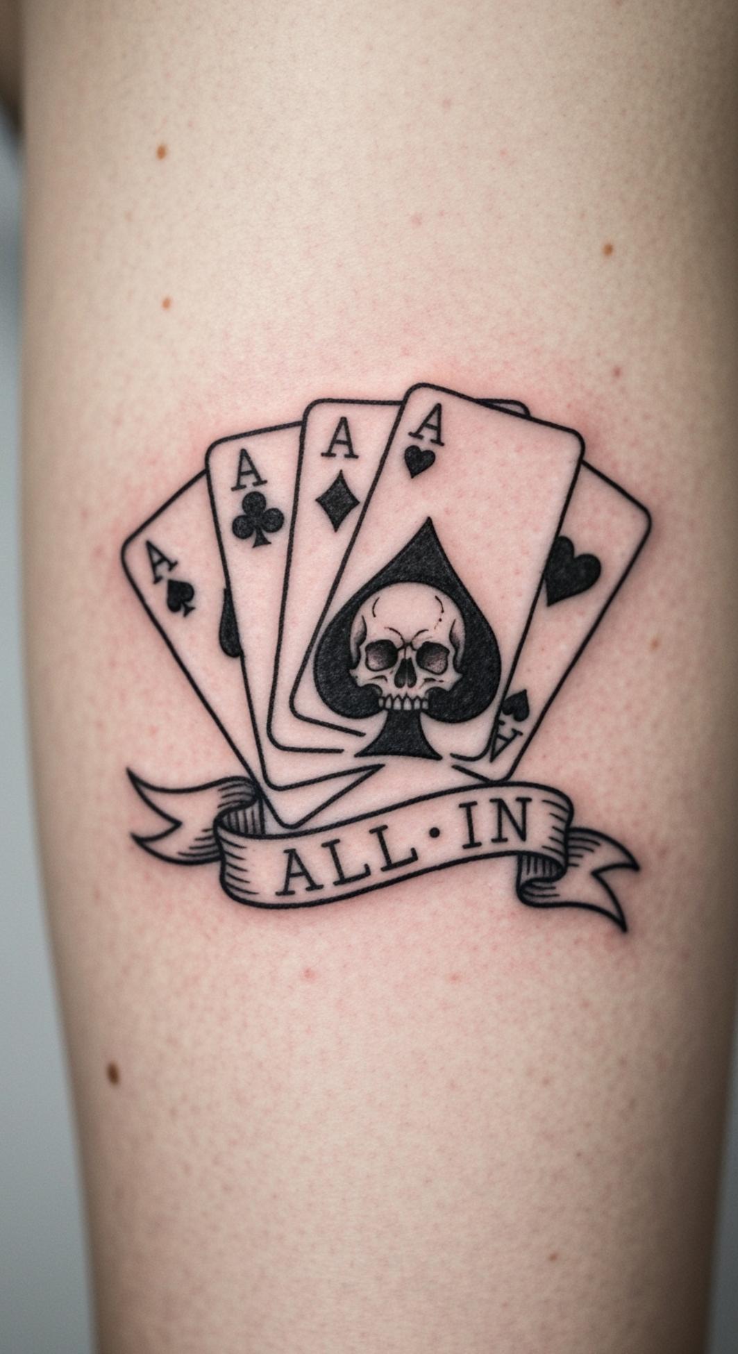 This tattoo embodies the spirit of risk and fate, drawing on the powerful imagery of four aces and a menacing skull, which together evoke the thrill and unpredictability of high-stakes decisions. The aces symbolize luck, mastery, and the ability to play one’s hand with confidence, while the skull embedded in the spade hints at the ever-present shadow of mortality and the courage required to face life’s ultimate gambles.