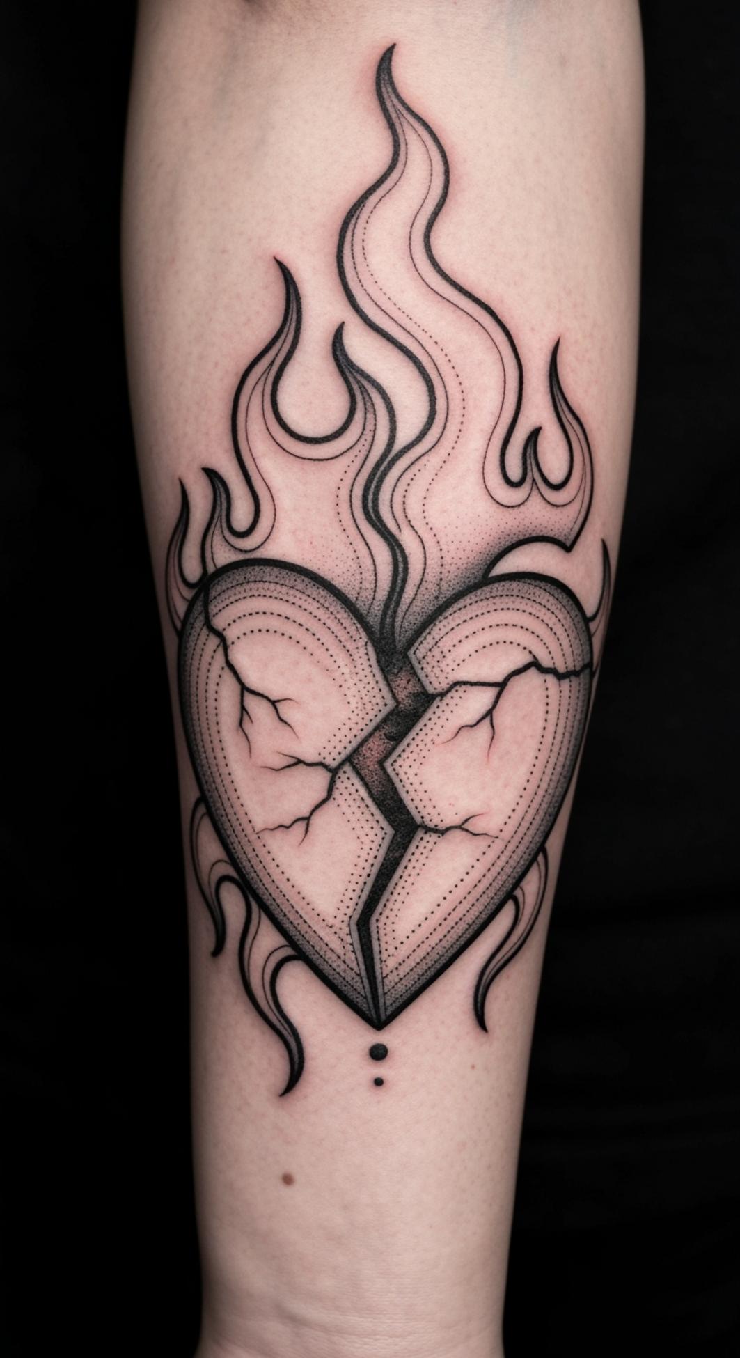 This tattoo fuses the timeless symbol of the broken heart with fierce, upward-rising flames, capturing the raw energy of pain transformed into power. The design speaks to enduring deep emotional trials—heartbreak, loss, or personal struggle—yet refusing to be subdued, instead allowing these experiences to ignite inner strength.