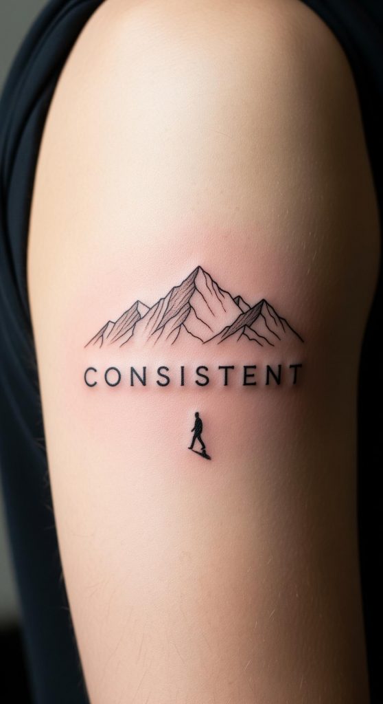 This tattoo powerfully embodies the relentless pursuit of progress, using the mountain range as a timeless symbol of enduring challenges and achieving personal growth. The solitary figure beneath the bold word “CONSISTENT” echoes the discipline required to overcome life’s obstacles, while the peaks above signify goals that can only be scaled through unwavering effort.