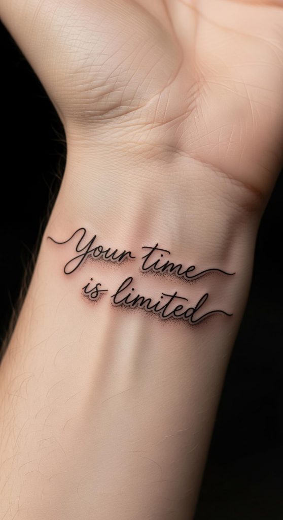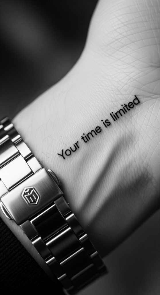 This tattoo embodies the stark, motivating reminder that our journey is finite, urging a sense of urgency and purpose in every action. The directness of the text strips away distractions, focusing the mind on the realities of time and the need to seize opportunities without hesitation.