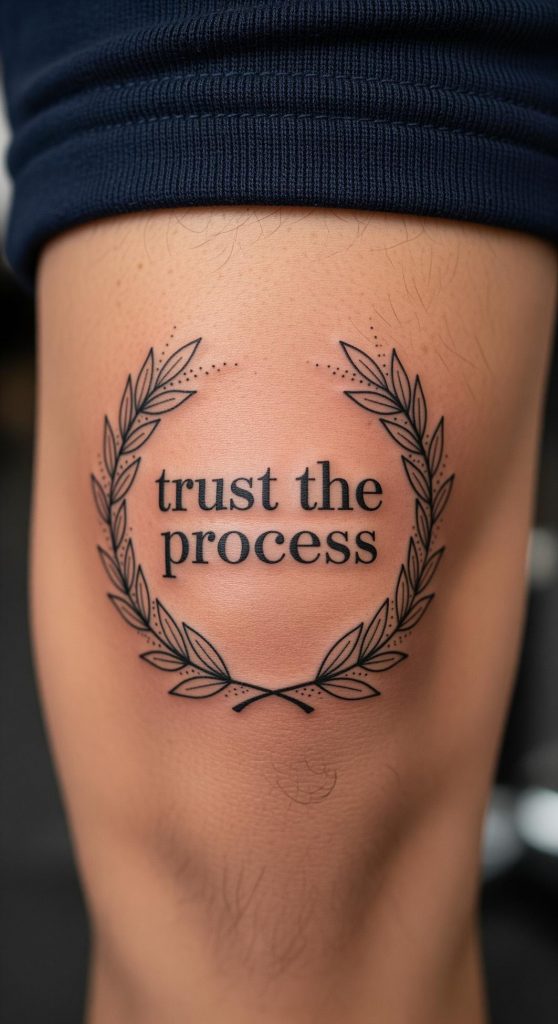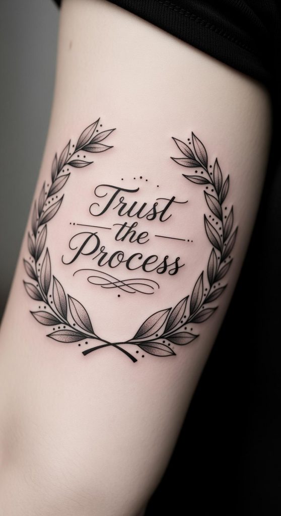 This tattoo seamlessly blends a powerful motivational phrase with the universal symbol of victory and growth, the laurel wreath, forging a statement about resilience and unwavering belief in one’s personal journey. The laurel, steeped in ancient tradition, has long represented triumph earned through perseverance, while the central quote serves as a reminder to remain steadfast during life’s challenges and uncertainties.