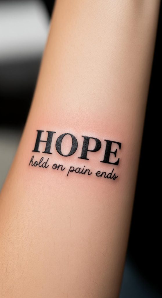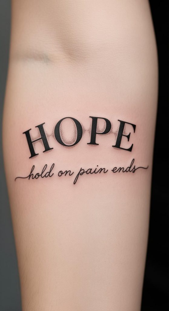 This tattoo centers on the powerful concept of hope, symbolizing perseverance and the relentless human drive to overcome adversity. By merging the bold statement of “HOPE” with the deeper phrase “hold on, pain ends,” it draws from centuries-old notions of resilience and the inner strength needed to face hardships.