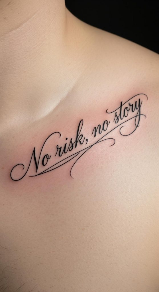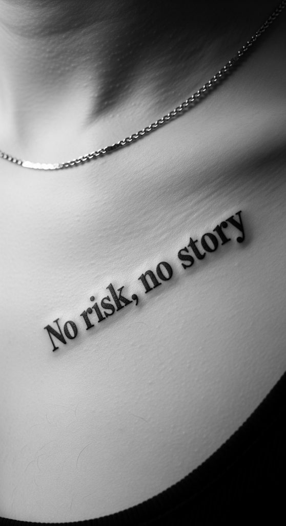 This tattoo centers on the succinct phrase “No risk, no story,” encapsulating the universal truth that true growth and memorable achievements are born from stepping beyond one’s comfort zone. The quote calls forth centuries of wisdom championing the valor of those who dare to embrace the unknown, echoing tales of pioneers, entrepreneurs, and icons who shaped their destinies through bold decisions.