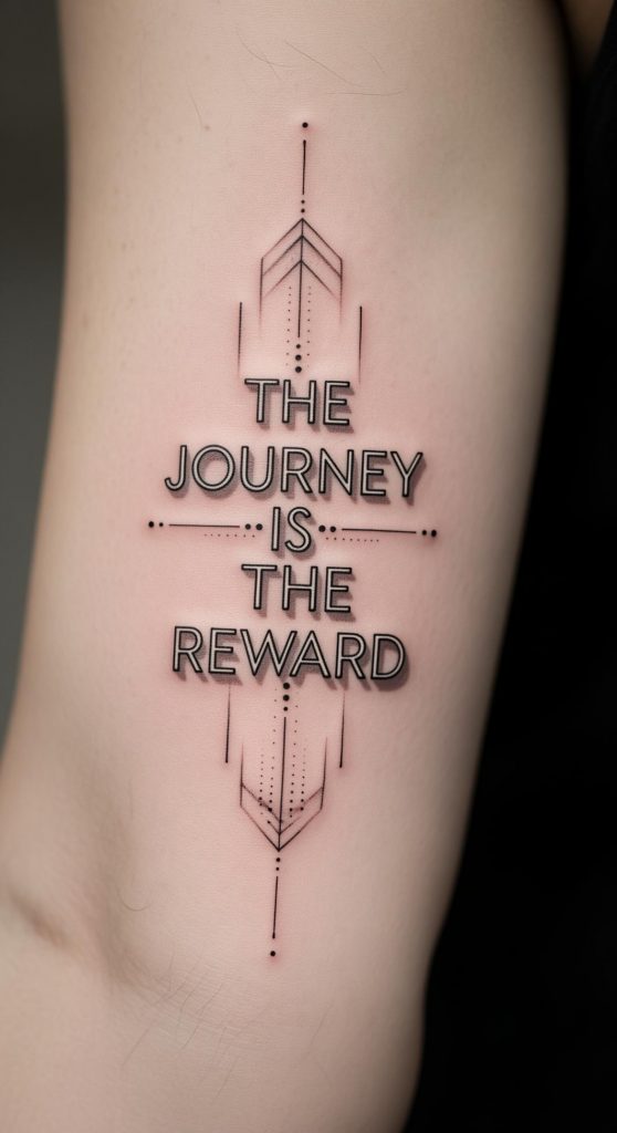 This tattoo captures the essence of embracing life’s experiences and finding fulfillment not in the destination, but in the process of overcoming challenges and personal growth. The straightforward phrasing echoes timeless wisdom found across cultures, reminding us that perseverance, adaptability, and learning from struggles are true measures of success.
