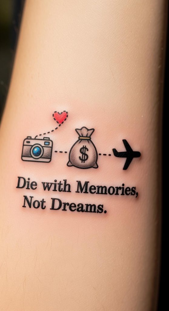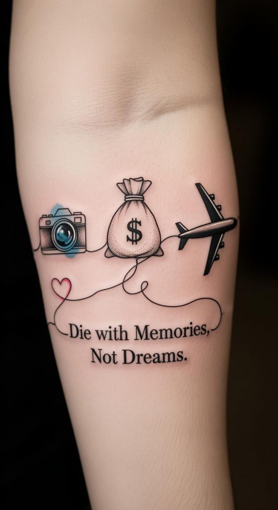 This tattoo encapsulates the spirit of living boldly and prioritizing meaningful experiences over mere aspirations. Integrated symbols—a camera, a money bag, and an airplane—reflect deep themes of adventure, personal growth, and the pursuit of fulfillment beyond material wealth.