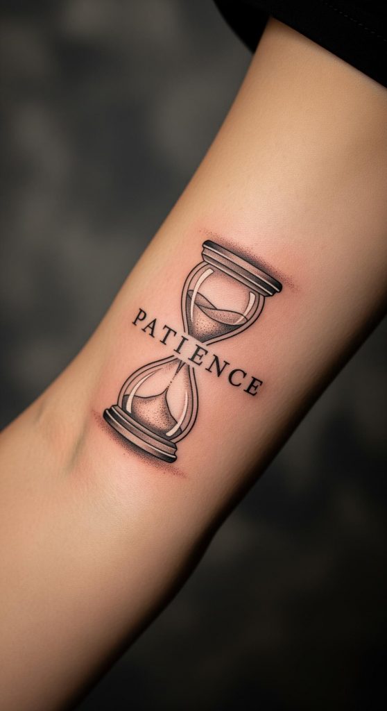 This tattoo concept embodies the timeless virtue of patience, symbolized through an hourglass motif intertwined with the bold lettering of the word itself. The hourglass, a classic metaphor for the passage of time, underscores themes of endurance, resilience, and the understanding that growth often requires waiting and persistence.