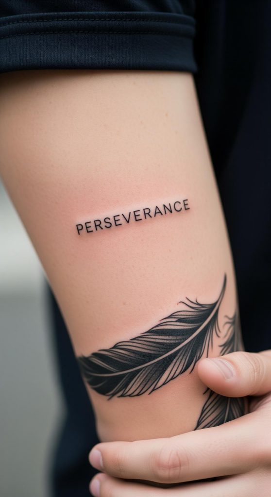 This tattoo powerfully embodies the enduring spirit of resilience, encapsulated in a single, impactful word. The minimalist design focuses the viewer’s attention on the core idea of relentless determination—a virtue celebrated across cultures and throughout history as a hallmark of greatness.