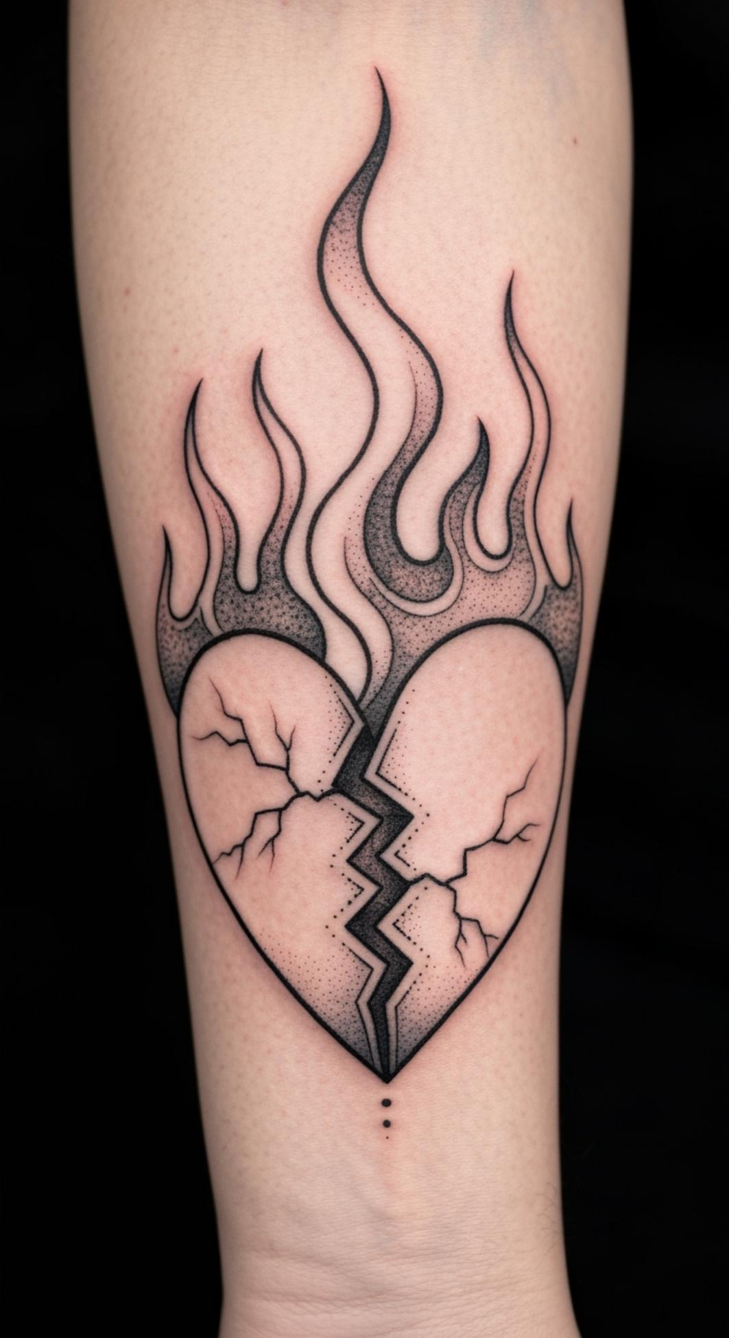 This tattoo concept brings together the raw power of emotion and the transformative force of endurance, symbolized by a heart riven by a bolt and crowned with flames. At its core, the design captures the essence of heartache and the fire that can be born from struggle, drawing on the universal narrative of pain forging resilience.