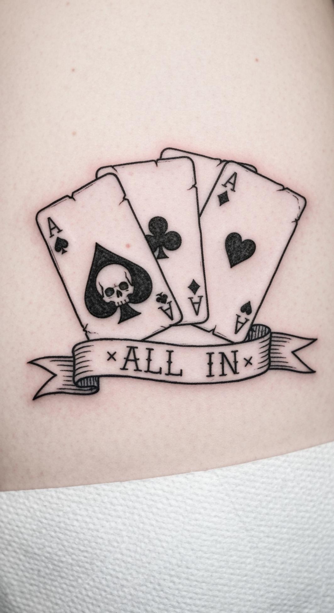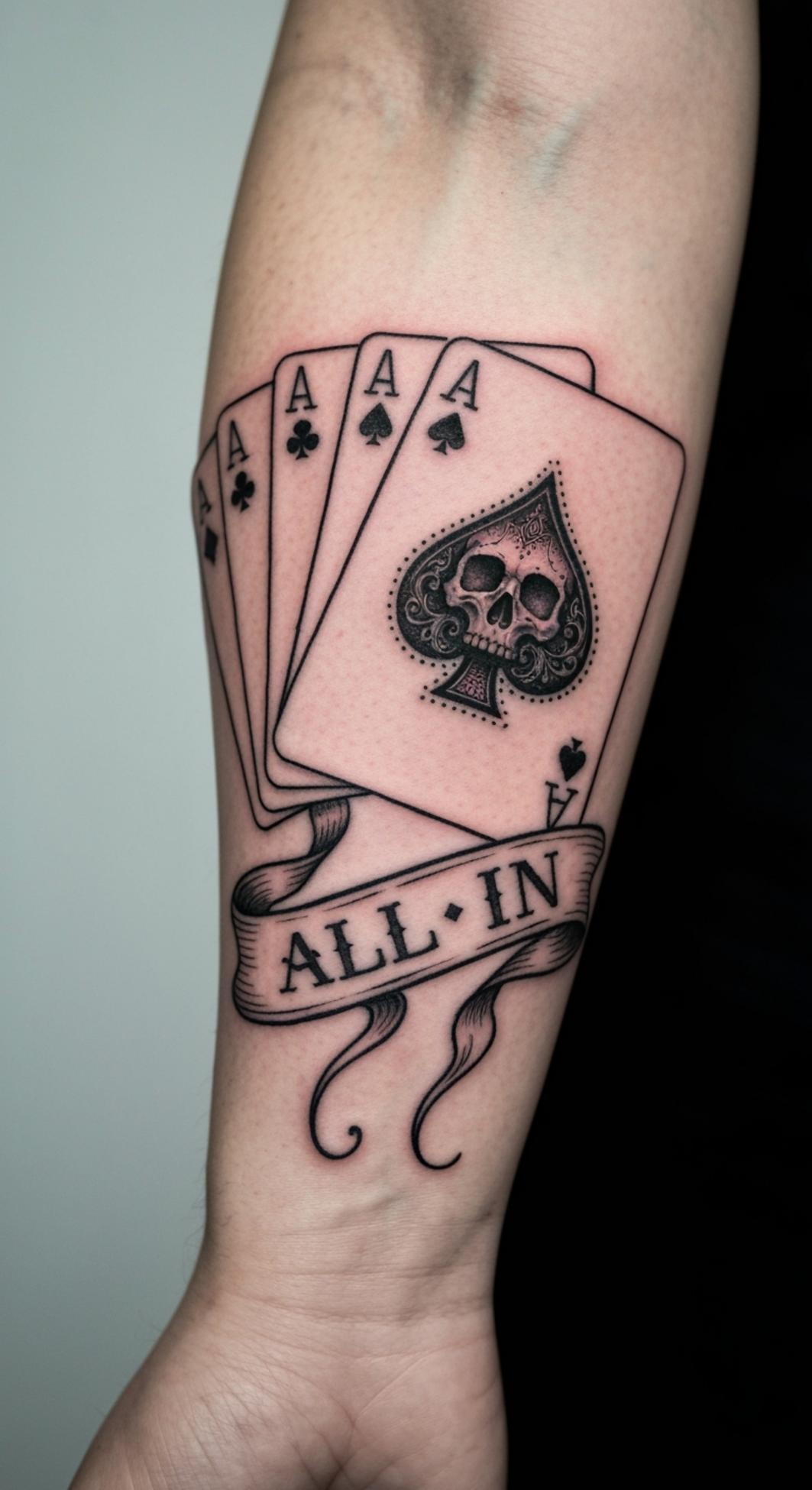 Embodying the spirit of risk and the relentless pursuit of victory, this tattoo concept draws deeply from classic symbolism associated with playing cards and the unpredictability of fate. The motif of aces—representing triumph, supremacy, and the element of chance—paired with the skull iconography, evokes themes of mortality, resilience, and defiance in the face of adversity.