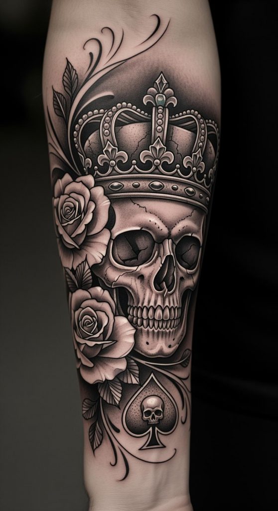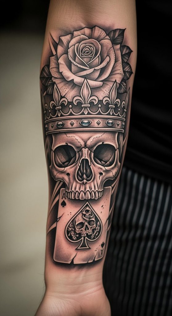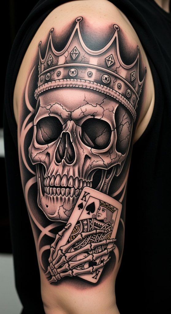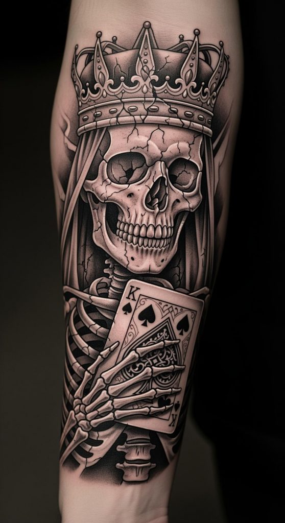 Boldly merging the primal symbolism of mortality and dominance, this tattoo weaves together the image of a crowned skull with the evocative power of the playing card, creating a statement on fate, risk, and strength in the face of life’s uncertainties. The crowned skull speaks to the authority and inevitability of death, a reminder that no man, regardless of status, escapes life’s ultimate truth, while the skeletal hand gripping a card hints at the ever-present gamble of existence and the courage to control one’s destiny.