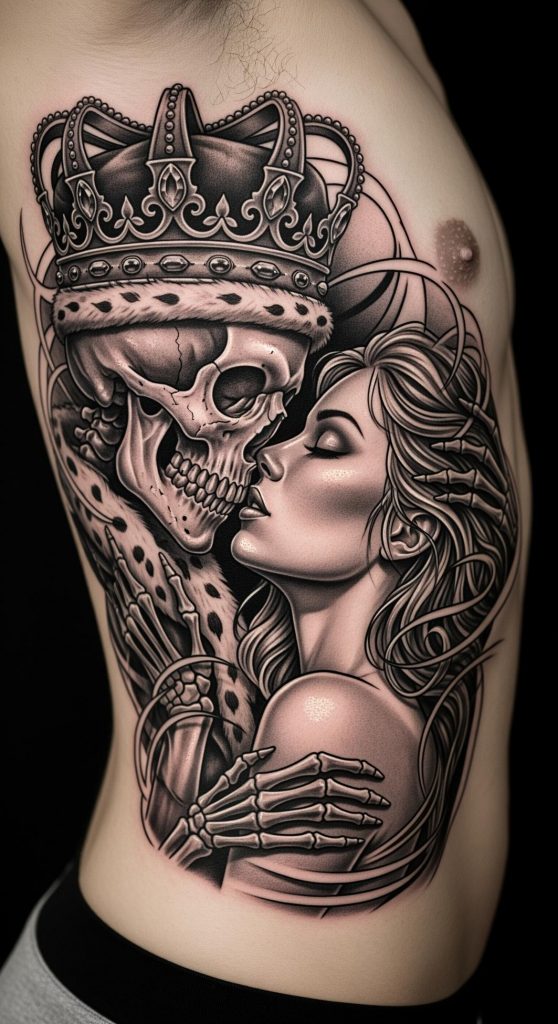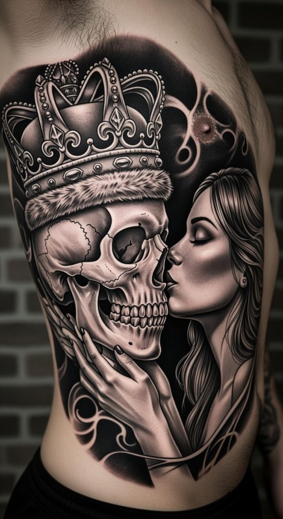 This striking tattoo concept uses the powerful imagery of a crowned skull entwined with a woman’s kiss to evoke themes of mortality, dominance, and the complex interplay between life and death. The crown atop the skull suggests not just authority, but the ultimate sovereignty of death—a reminder that even kings are not immune to the passage of time.