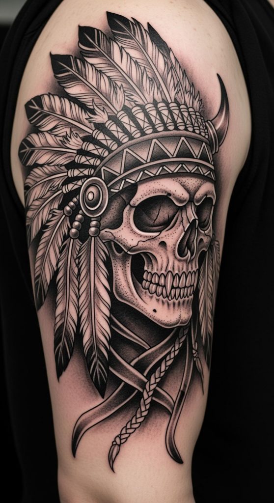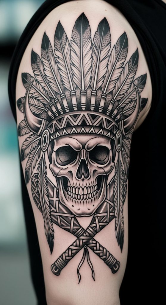This tattoo merges the enduring symbol of the skull with the commanding presence of a feathered headdress and crossed tomahawks, resonating with themes of mortality, legacy, and unyielding spirit. The headdress evokes a sense of leadership, respect, and pride, while the skull beneath it transforms the design into a reflection on the balance between life, death, and honor.