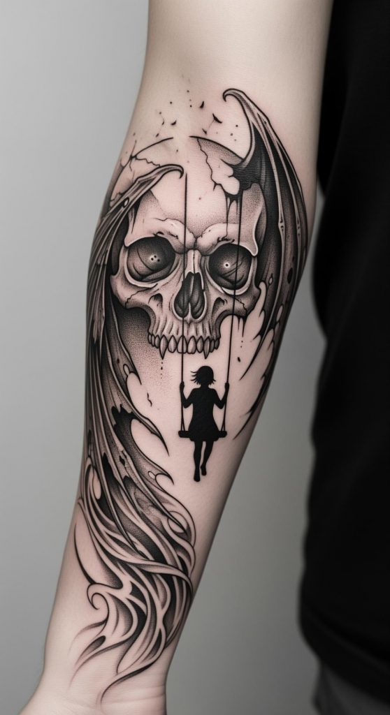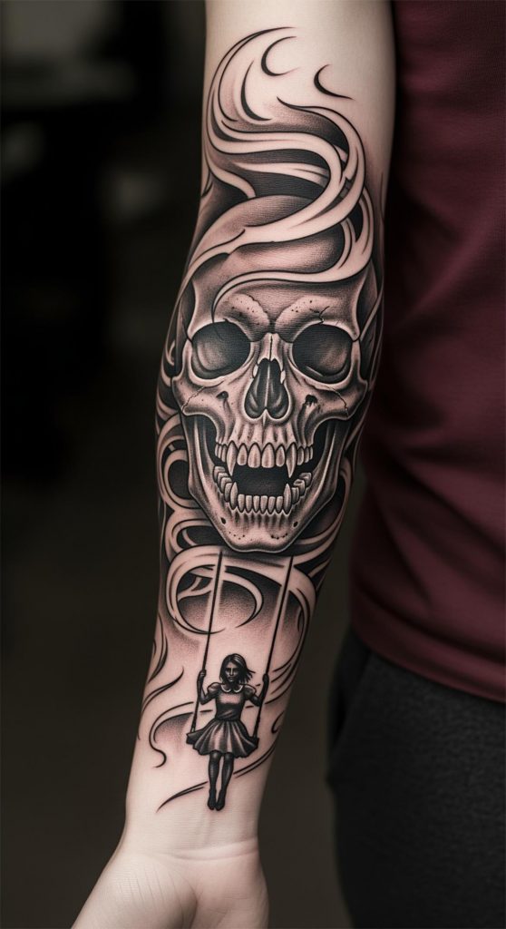 Channeling the raw essence of mortality and inner confrontation, this tattoo powerfully juxtaposes a looming skull enshrouded by shadowy, dynamic forms with the innocence of a lone figure on a swing, invoking themes of fate, protection, and the cyclical nature of life. The skull—long a symbol of impermanence and unwavering strength—emerges through swirling darkness, capturing the reality of confronting one’s fears and the resilience forged within struggle.