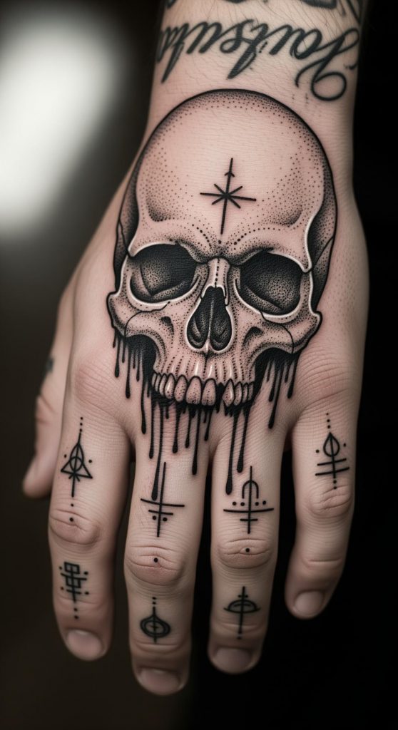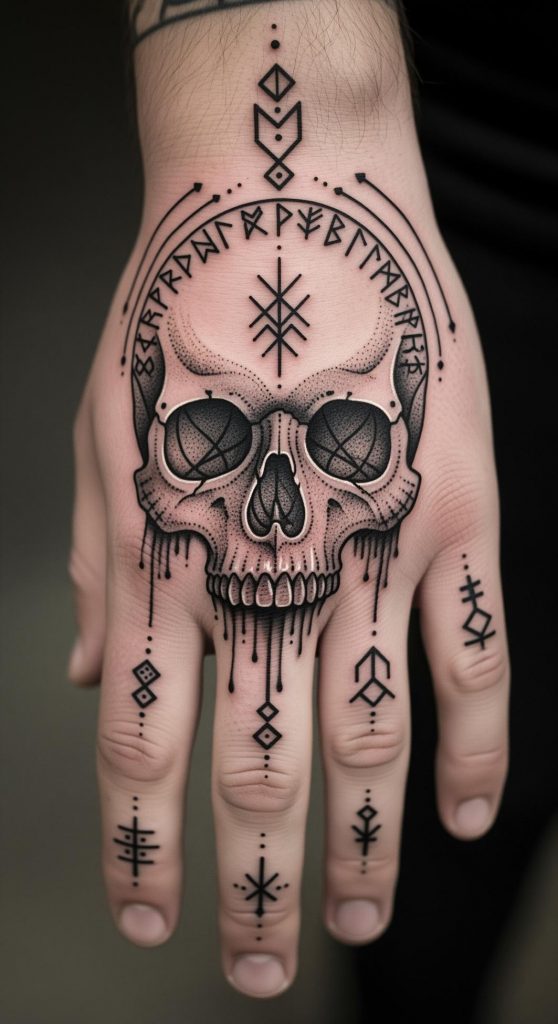 This powerful tattoo artfully blends the timeless symbol of the skull with mystic sigils and geometric forms, capturing the essence of mortality and the relentless pursuit of wisdom. The skull, marked by intricate runic patterns and arcane symbols, invokes ancient traditions where it represented the gateway between life and death, inspiring both fear and respect.