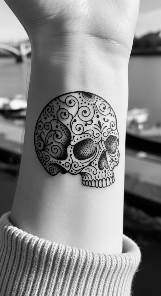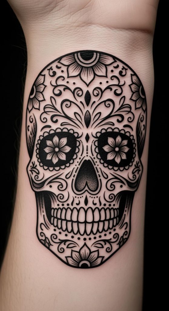 This striking tattoo fuses the iconic skull motif with intricate ornamental patterns, symbolizing the powerful duality of mortality and the enduring spirit. Embellished with swirling designs reminiscent of ancient warrior markings, the piece draws on the rich history of the skull as a talisman for strength in the face of adversity.