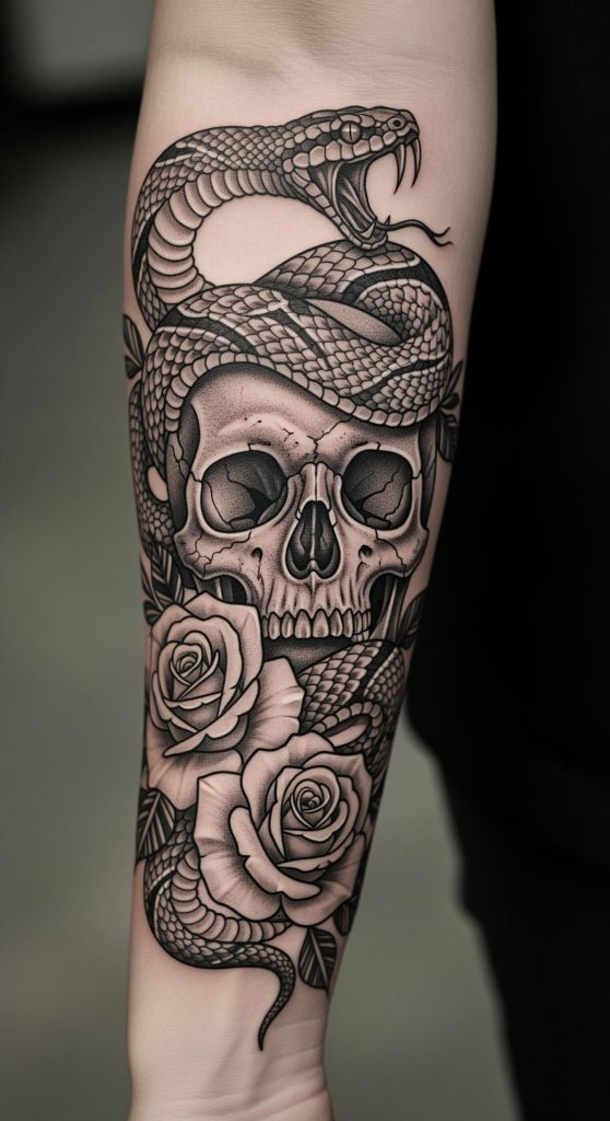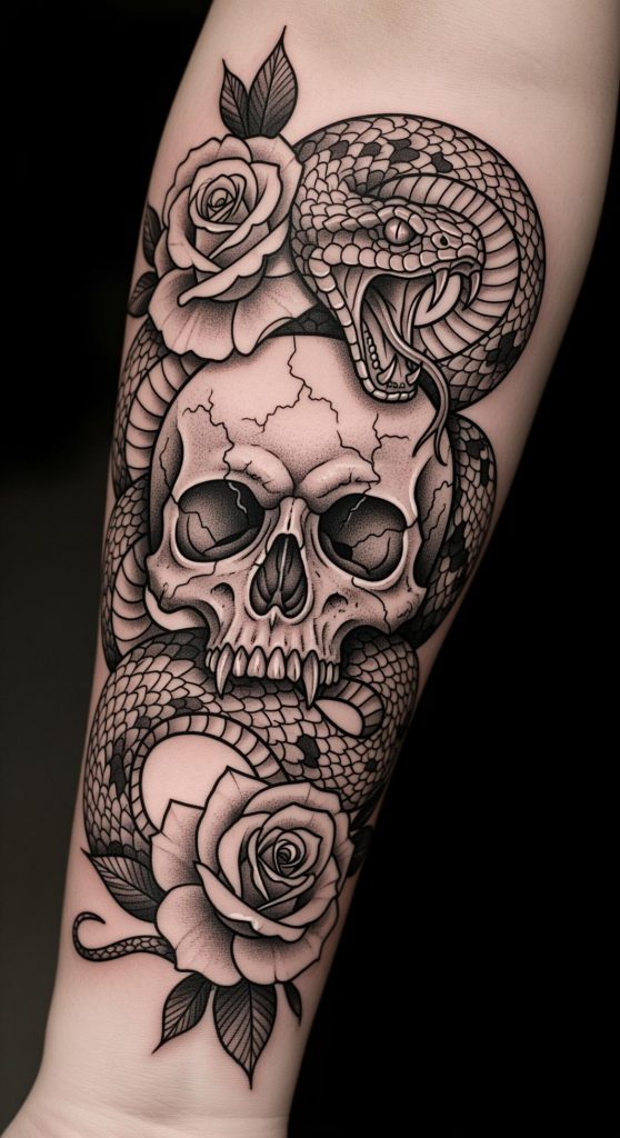 This tattoo merges primal power and mortality through the interplay of a detailed skull, a coiling serpent, and blooming roses, each symbol intensifying the tattoo’s striking impact. The skull represents the relentless reality of life’s impermanence, while the serpent evokes themes of transformation, dangerous wisdom, and the perpetual struggle between life and death.