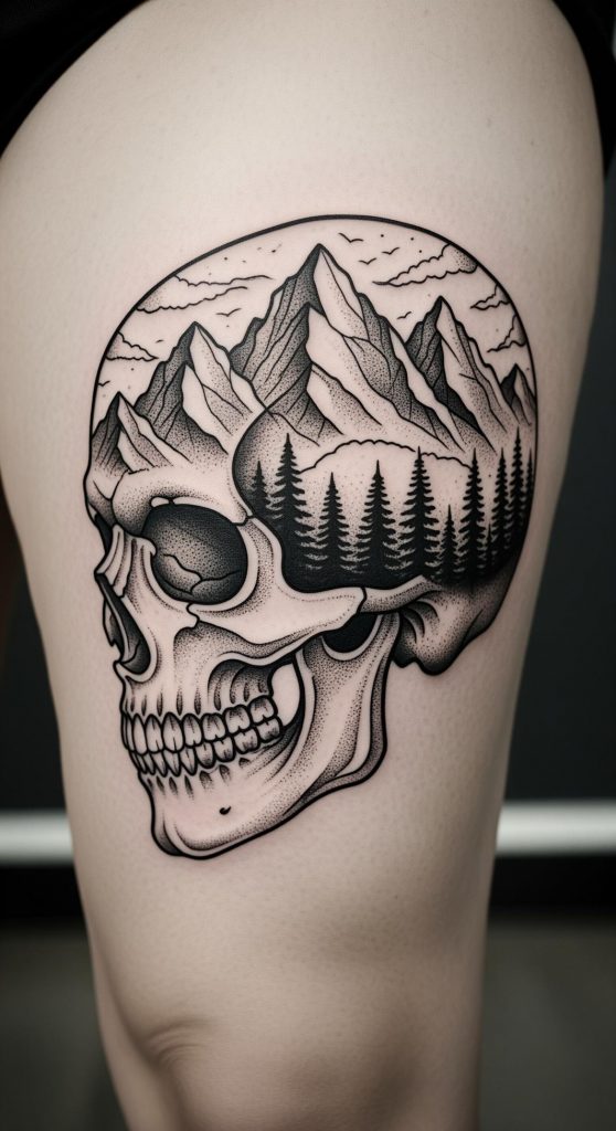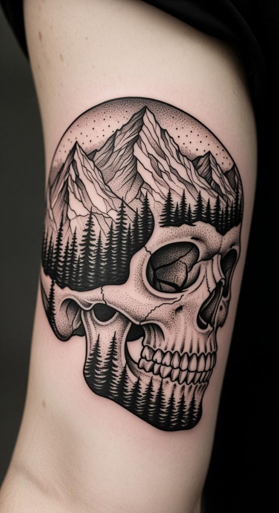 This tattoo fuses the enduring power of mortality with the eternal resilience of nature, creating a striking symbol of life’s duality and the courage to navigate its edges. Featuring a skull that holds an intricate landscape of mountains and dense pine forests within, the design represents both the inevitability of endings and the enduring force of personal strength.
