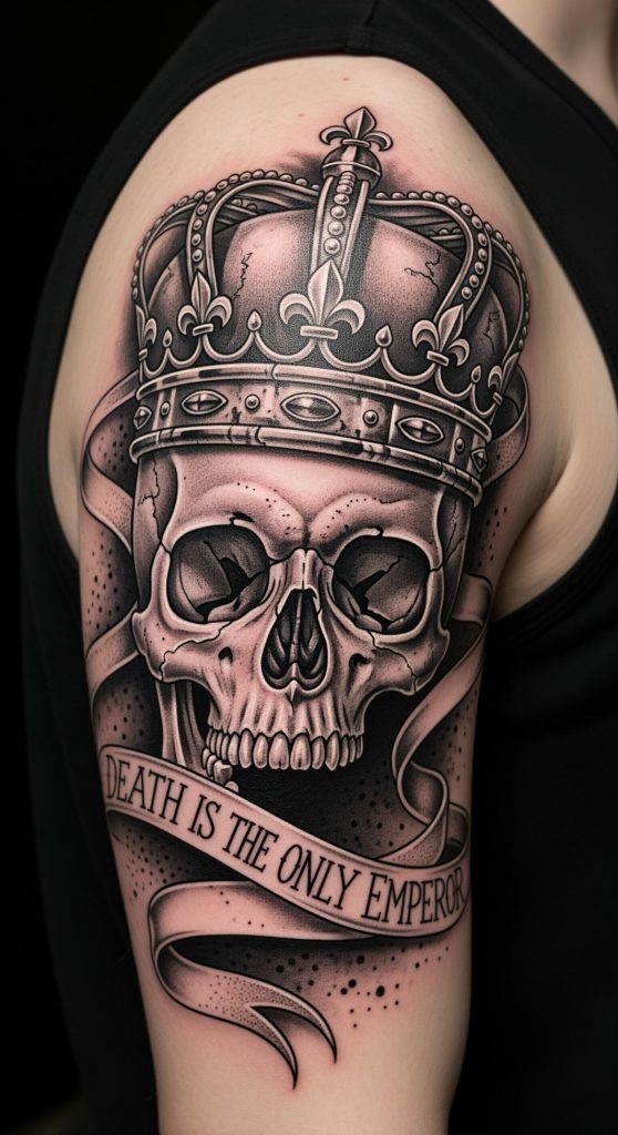 This tattoo masterfully unites the iconography of a crowned skull with a resolute phrase, merging themes of mortality, power, and the unyielding nature of fate. The crown atop the skull signals not just dominance but the fleeting essence of earthly authority, evoking the ancient reminder that even kings must kneel before the inevitable.